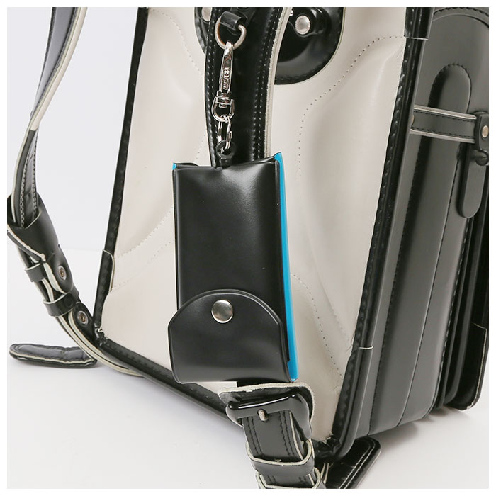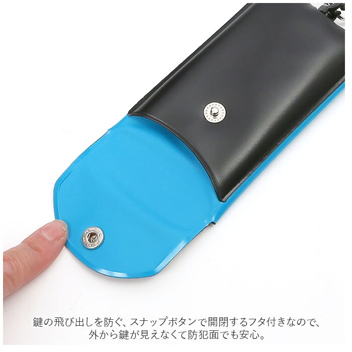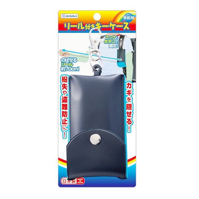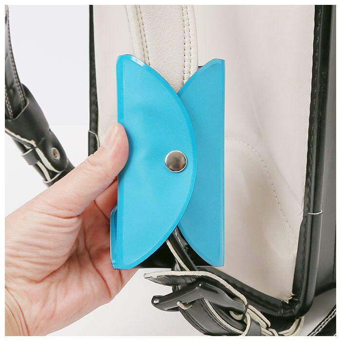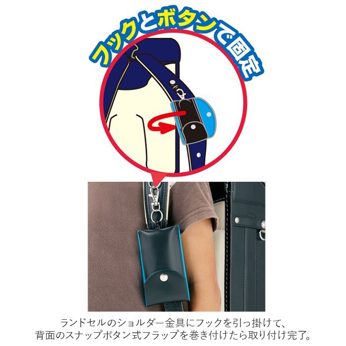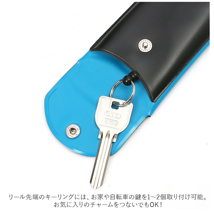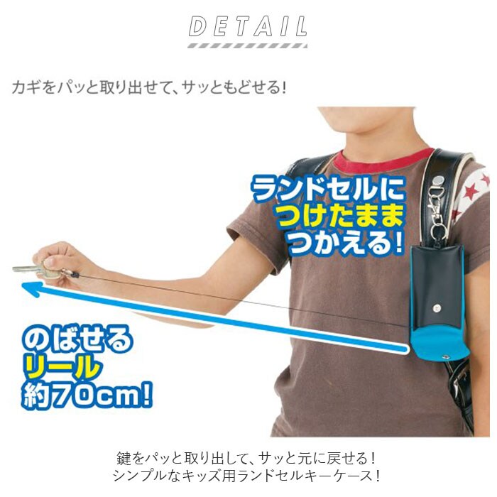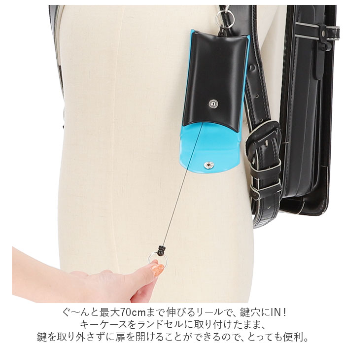 | 商品説明 | 鍵をパッと取り出して、サッと元に戻せる!シンプルなキッズ用ランドセルキーケース!ランドセルのショルダー金具にフックを引っ掛けて、背面のスナップボタン式フラップを巻き付けたら取り付け完了。ぐ~んと最大70cmまで伸びるリールで、鍵穴にIN!キーケースをランドセルに取り付けたまま、鍵を取り外さずに扉を開けることができて、とっても便利。鍵の飛び出しを防ぐ、スナップボタンで開閉するフタ付きなので、外から鍵が見えなくて防犯面でも安心。リール先端のキーリングには、お家や自転車の鍵を1~2個取り付け可能。お気に入りのチャームをつないでもOK!雨の水滴やちょっとした汚れも簡単に拭き取れる、PVC樹脂素材を採用。両サイドが配色になったちょっぴりお洒落なバイカラーデザインがワンポイント。 |