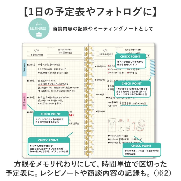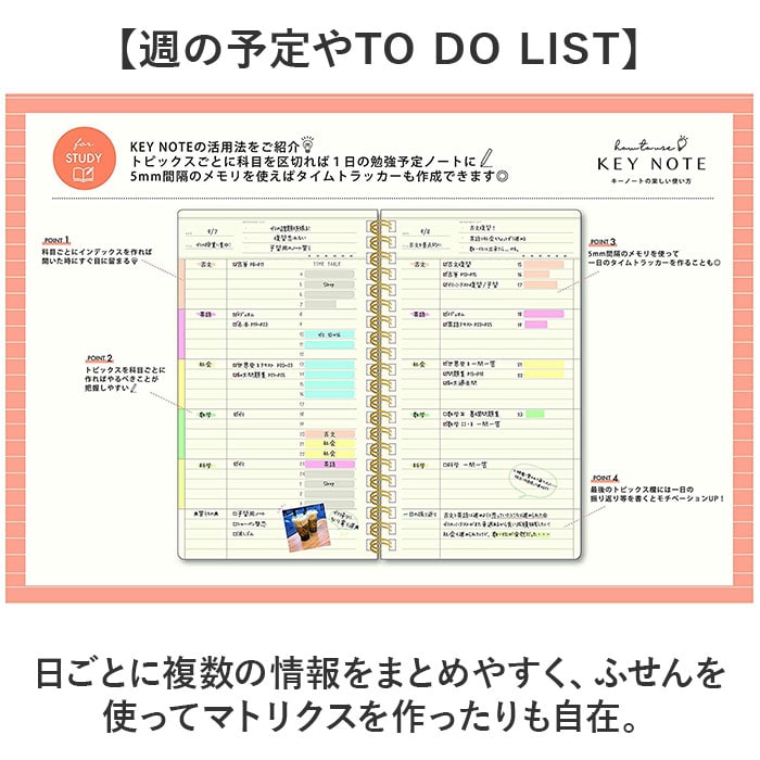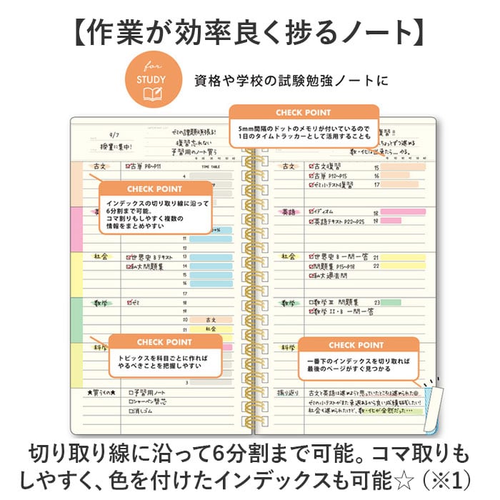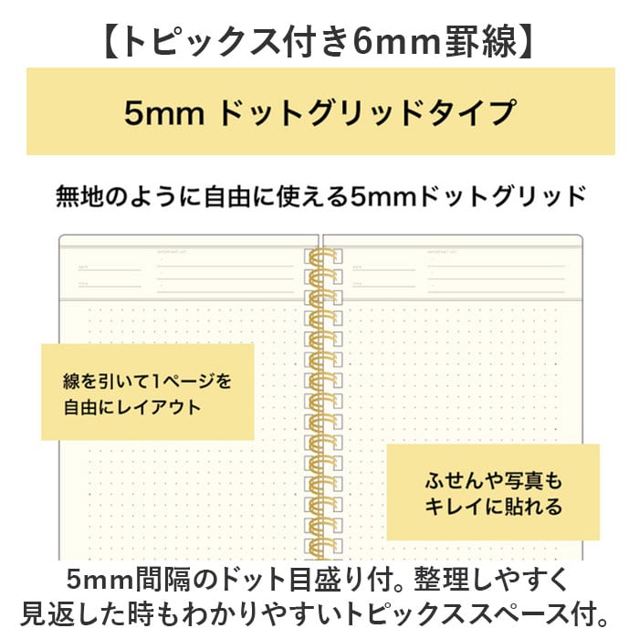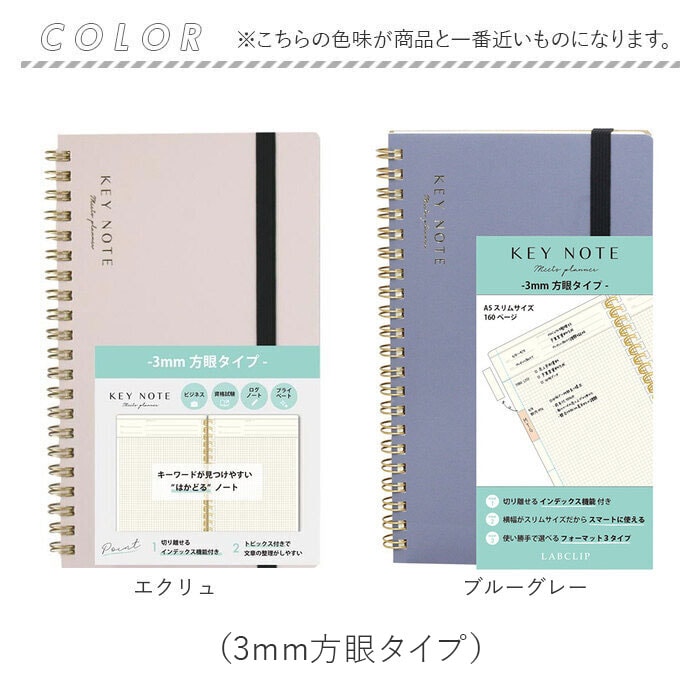 | 商品説明 | 【仕事でもプライベートでも重宝】目標を立てておしゃれに毎日を記録♪スマートに持ち歩ける160P「キーノート A5スリム」【カバンにすっぽりA5のスリム設計】スリムな横幅で、いつでも持ち歩きOK。外出先やテレワーク等、スペースの限られた場所でも。【切り離せるインデックス機能】切り取り線に沿って切り離すとインデックスに。1番下を切り取ると最終ページがすぐ見つかる◎【チェックリスト代わりにもおすすめ】TO DO LISTとして使う際、完了したら切り取り線で折る!全て終えたら切り離しも。【作業が効率良く捗るノート】切り取り線に沿って6分割まで可能。コマ取りもしやすく、色を付けたインデックスも可能☆(※1)インデックスなどの数は全て同じですが、5mmドットグリッドタイプはお好みの位置で区切って使用できます。【各ページにうれしい見出し付き】日付けやタイトル、などを記入できるスペース。おおまかな内容を把握しやすいつくり。【フレキシブルに使える3種類】・3mm方眼/6mm罫線/5mmドットグリッドの3タイプ。用途やお好みでチョイス☆【文字が書きやすい3mm方眼】グラフやイラストも描きやすい薄めの線。余白も取りやすく文字を書く時は6mm方眼としても。【1日の予定表やフォトログに】方眼をメモリ代わりにして、時間単位で区切った予定表に。レシピノートや商談内容の記録も。(※2)3mm方眼タイプは、薄めの線で区切られたトピックス付きです。【トピックス付き6mm罫線】・5mm間隔のドット目盛り付。整理しやすく見返した時もわかりやすいトピックススペース付。【資格や学校での試験勉強に】科目ごとにトピックスを作成したり、1日のタイムラッカーとしても活用。【自由に使える5mmドットグリッド】ふせんや写真も貼りやすく、線を引いたり自由にレイアウト。無地ノートのように使える!【週の予定やTO DO LIST】日ごとに複数の情報をまとめやすく、ふせんを使ってマトリクスを作ったりも自在。 |