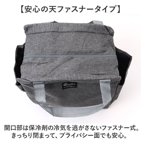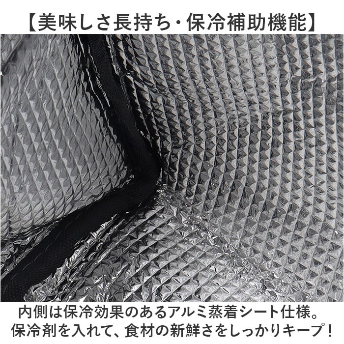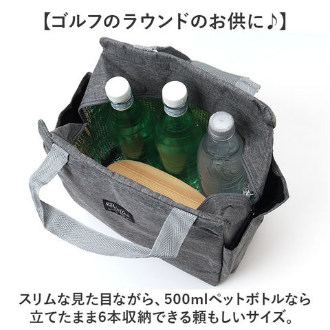 | 商品説明 | 【シンプルなスクエアデザイン】端正なスクエアフォルムとしっかりあるマチ幅と深さで、大きめお弁当箱も平置きのままOK!【美味しさ長持ち・保冷補助機能】内側は保冷効果のあるアルミ蒸着シート仕様。保冷剤を入れて、食材の新鮮さをしっかりキープ!【安心の天ファスナータイプ】開口部は保冷剤の冷気を逃がさないファスナー式。きっちり閉まって、プライバシー面でも安心。【たたむと、とってもコンパクト】折りたたんでカバンに入れておけば、お仕事帰りにスウィーツをちょこっと買いした時に便利。【ゴルフのラウンドのお供に♪】スリムな見た目ながら、500mlペットボトルなら立てたまま6本収納できる頼もしいサイズ。【便利なサイドポケット】両サイドには深さのあるサイドポケット付きで、折り畳み傘や小物収納に便利。 |