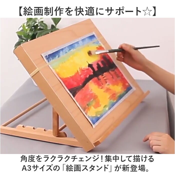 | 商品説明 | 【絵画制作を快適にサポート☆】角度をラクラクチェンジ!集中して描けるA3サイズの「絵画スタンド」が新登場。【支え不要◎定位置で絵を描ける】ゴムでキャンバスを固定。手の支え不要、片手にパレットを持ちながら筆を走らせることが可能。【お好みに合わせて4段階角度調節】スタンドの角度は、4段階調節OK。U型のくぼみにセットするだけで、安定性もキープ。(※1)ケガ防止のため、セットするくぼみがある部分の端が丸く面取りされています。【衝撃を抑えて傷つきもガード】底面四隅には滑り止め付き。デスクに置く時も静かで、傷つけにくい◎【折りたたんでスリムに持ち運び】使わない時は、スタンド部分を折りたためるつくり。持ち運びもスマートに。【長く使えるナチュラルデザイン】程よく厚みがあり、自然な風合いの木製アイテム。キャンバスサイズに合わせて揃えるのもおすすめ。(※2)当店別ページにて、サイズ違いのスタンドを販売中です。 |