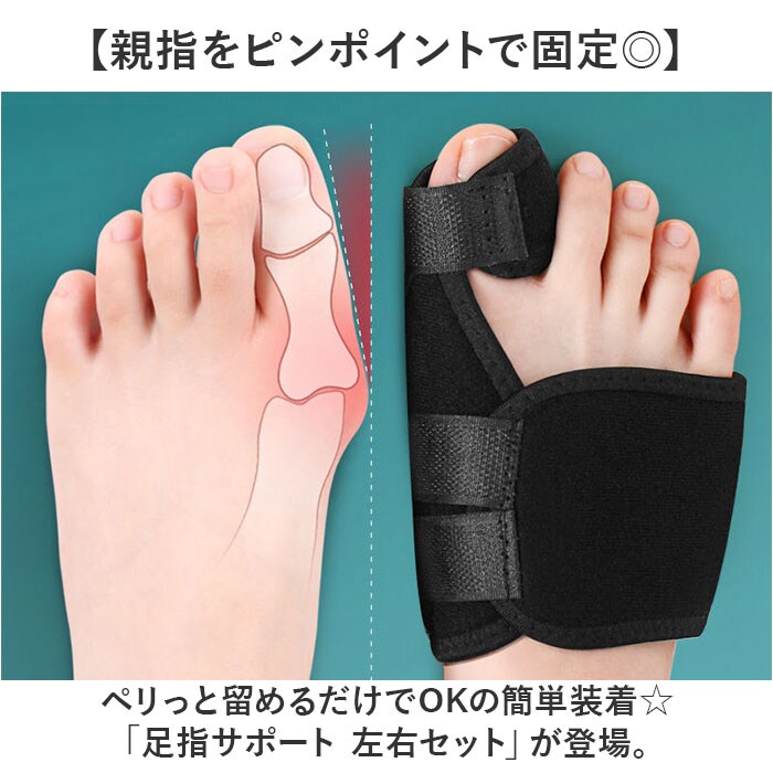 | 商品説明 | 【親指をピンポイントで固定◎】ペリっと留めるだけでOKの簡単装着☆「足指サポート 左右セット」が登場。【テーピングベルトで親指を固定!】親指のサイドには固定用プレートを内蔵。面ファスナーベルトでぐるりと固定してくれる!【調節ベルトでジャストフィット】足の甲部分を固定できる2本のベルトは、お好みのキツさでとめられる、面ファスナータイプ。【寝ている間も親指を安定】親指をピンポイントで固定するから、寝ている間のケアとしても大活躍!お家時間も親指を保護【いつでも手洗いOKで清潔!】汚れが気になった丸洗いOK。いつでも清潔さをキープできるから、繰り返し長く愛用可能。 |