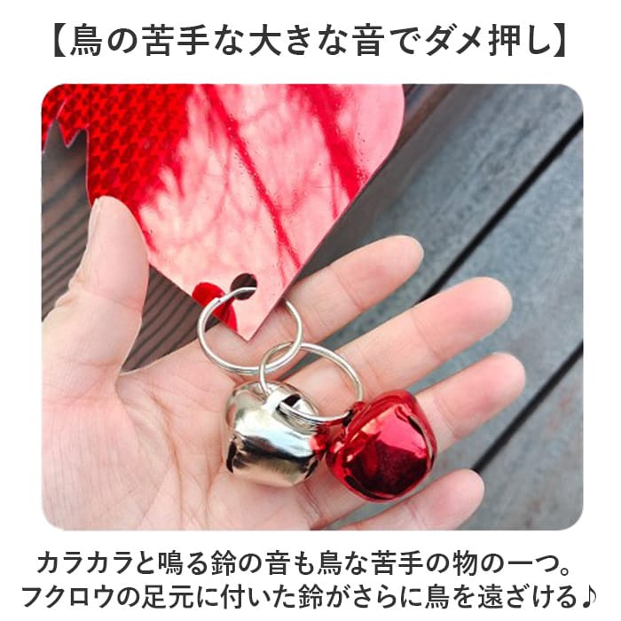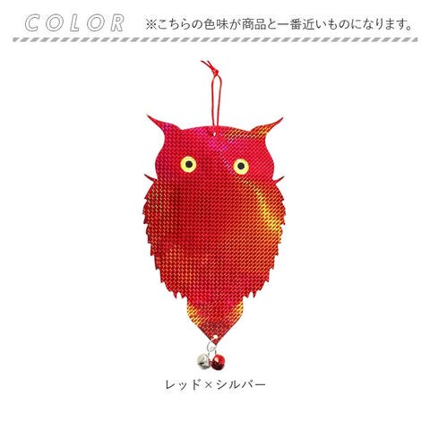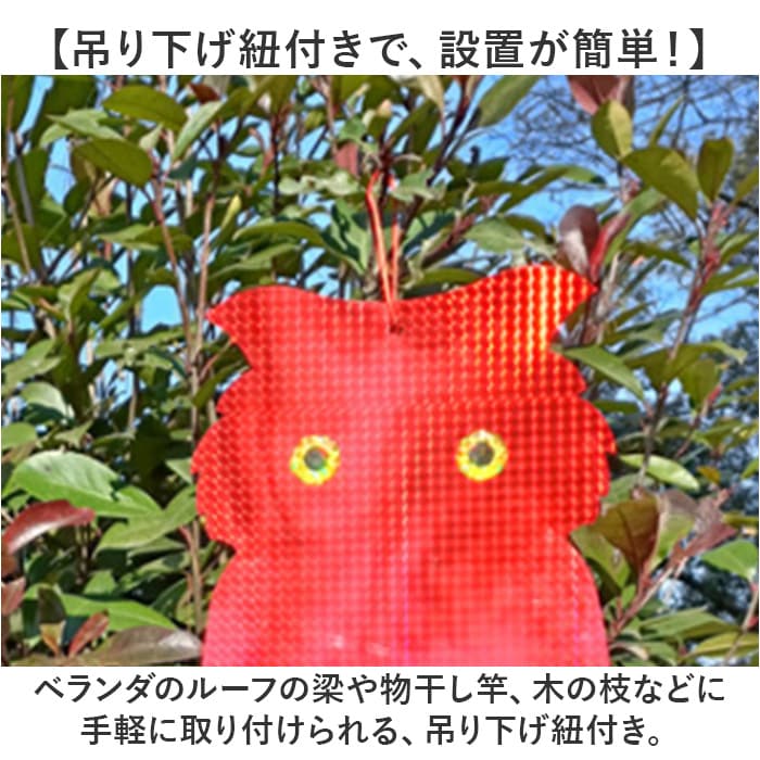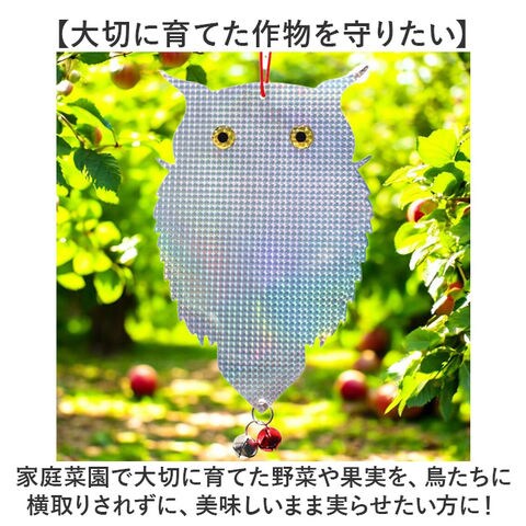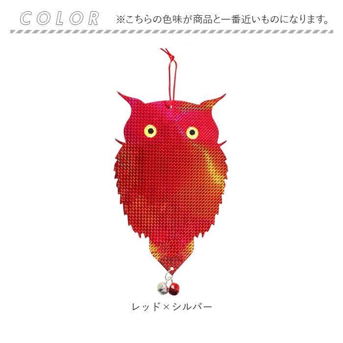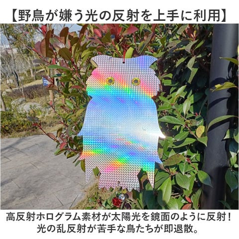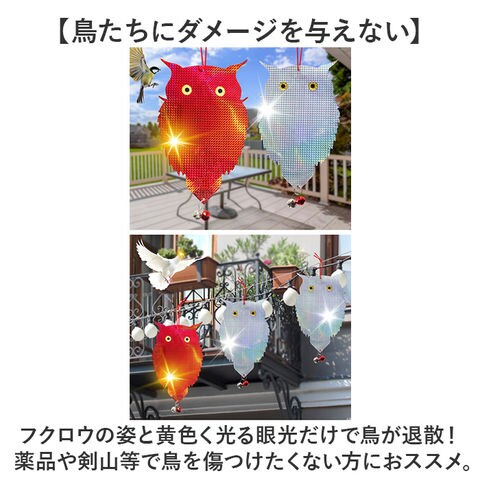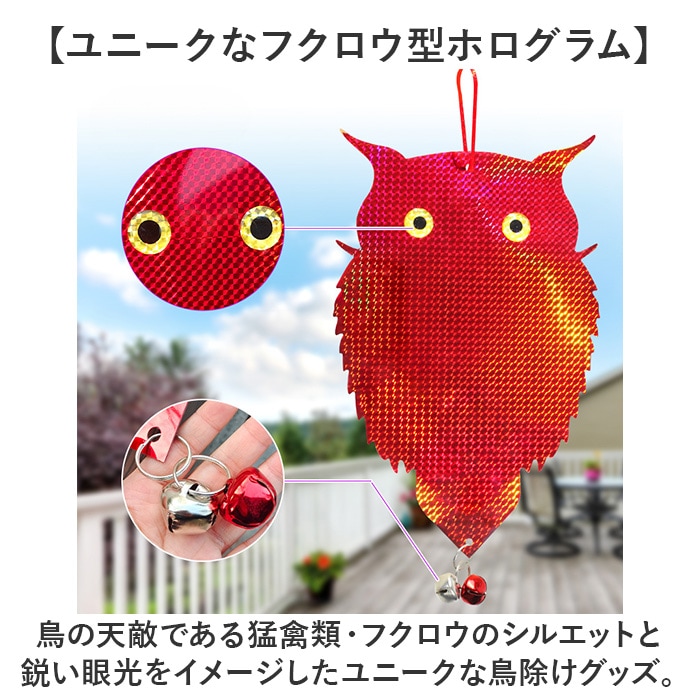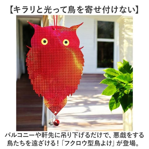 商品説明【キラリと光って鳥を寄せ付けない】バルコニーや軒先に吊り下げるだけで、悪戯をする鳥たちを遠ざける!「フクロウ型鳥よけ」が登場。【ユニークなフクロウ型ホログラム】鳥の天敵である猛禽類・フクロウのシルエットと鋭い眼光をイメージしたユニークな鳥除けグッズ。【野鳥が嫌う光の反射を上手に利用】高反射ホログラム素材が太陽光を鏡面のように反射!光の乱反射が苦手な鳥たちが即退散。【鳥の苦手な大きな音でダメ押し】カラカラと鳴る鈴の音も鳥な苦手の物の一つ。フクロウの足元に付いた鈴がさらに鳥を遠ざける♪【吊り下げ紐付きで、設置が簡単!】ベランダのルーフの梁や物干し竿、木の枝などに手軽に取り付けられる、吊り下げ紐付き。【大切に育てた作物を守りたい】家庭菜園で大切に育てた野菜や果実を、鳥たちに横取りされずに、美味しいまま実らせたい方に!【長期間効果を発揮する高耐久素材】雨に濡れたり、太陽光に晒されても劣化しにくい高耐久素材を使用。長く使えてとっても経済的。【鳥たちにダメージを与えない】フクロウの姿と黄色く光る眼光だけで鳥が退散!薬品や剣山等で鳥を傷つけたくない方におススメ。【さまざまなシーンで大活躍】ご家庭のベランダや屋上だけなく、果樹園など農業関係の方からも支持されているお役立ちグッズ。