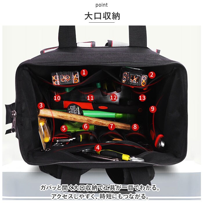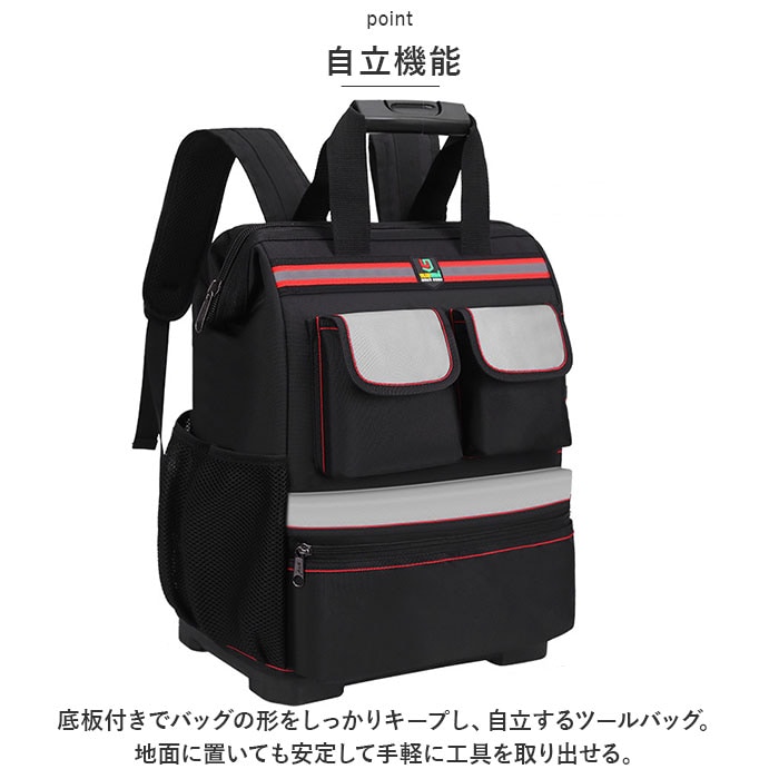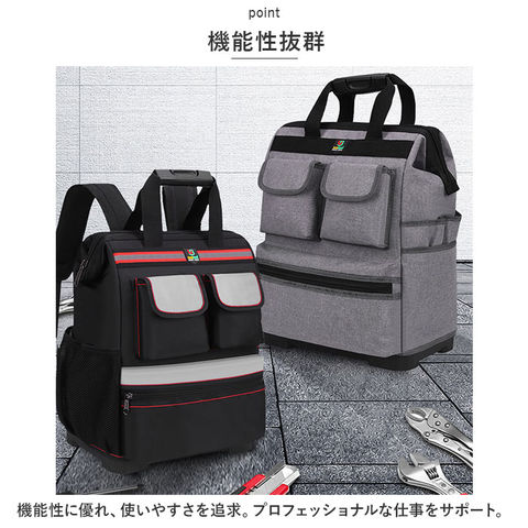 | 商品説明 | ガバっと開いてしっかり収納!ポケットがたくさんで機能性も充実の「ツールバッグ」が登場【大容量サイズ】たくさんの工具を収納できる大容量。どんなシチュエーションでも対応力抜群。頼れる存在感。【多機能ポケット】多数のポケットで工具を綺麗に仕分け。整理整頓もスムーズ。効率的な作業へ。【機能性抜群】機能性に優れたデザイン。使いやすさを追求。プロフェッショナルな仕事をサポート。【自立機能】底板付きでバッグの形をしっかりキープし、自立するツールバッグ。地面に置いても安定して手軽に工具を取り出せる。【背面クッション】背面にクッション性を備えた設計。長時間の使用でも快適。肩にも優しい。【大口収納】ガバッと開く大口収納で工具が一目でわかる。アクセスしやすく、時短にもつながる。【プラスチックハンドル】持ち手にプラスチックハンドルを採用。持ち運びも楽に。移動もストレスフリー。【反射テープ】反射テープ付きで安全性も確保。夜間作業でも目立つ。安心して作業に集中できる。(※反射テープはブラックタイプのみに付きます。グレーには付きません。)【ポケット仕様】フロント部分:フラップ付き面ファスナーポケット×2、ファスナーつきポケット×1サイド:オープンポケット×1、工具差し?2、メッシュポケット×1メイン収納:オープンポケット×12、ファスナーつきポケット×1(※生産時期によって、正面のLOGO有無が混在しています。お選び出来ませんのでご了承下さい。) |