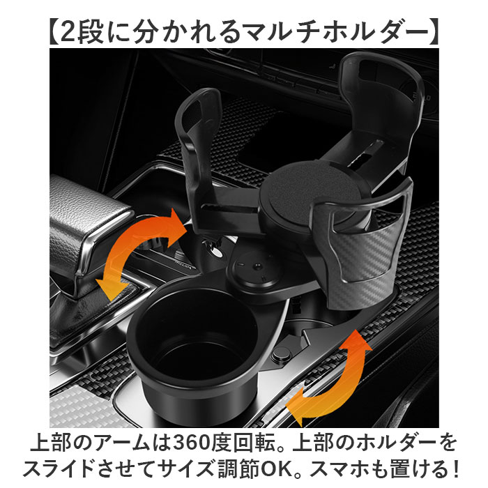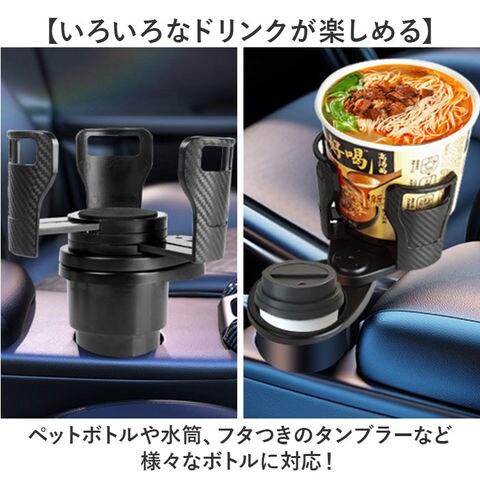 | 商品説明 | 【楽しくドライブ♪】便利で多機能!カップ麺も置けちゃう「ホルダー 車用品」が登場。【いろいろなドリンクが楽しめる】ペットボトルや水筒、フタつきのタンブラーなど様々なボトルに対応!【2段に分かれるマルチホルダー】上部のアームは360度回転。上部のホルダーをスライドさせてサイズ調節OK。スマホも置ける!【置くだけで簡単設置】既存のドリンクホルダーに置くだけだから車種を選ばず取り付け可能。【滑り止め付きで安心】底面に付属の滑り止めクッションを貼り付ければ、カタカタ音がしにくく、安定感もアップ!【選べる2タイプ】設置するドリンクホルダーの大きさに合わせて選べる2タイプ。【シンプルなデザイン】シートや車の色合いとも合わせやすいブラックカラー。ドライブが楽しくなる便利なアイテム♪ |