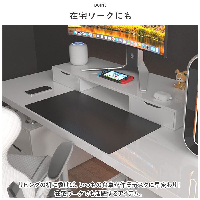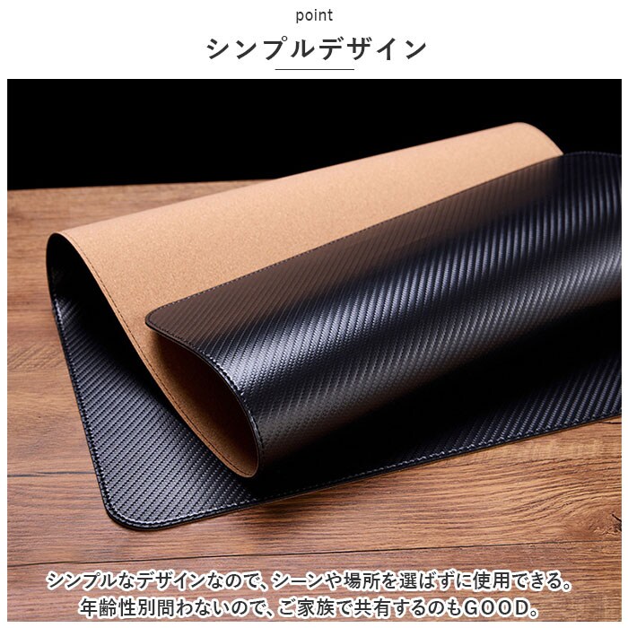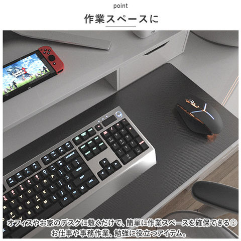 | 商品説明 | マットを敷いてPC作業などデスク業務をスムーズに♪撥水加工で汚れに強い「デスクマット」が登場!【作業スペースに】オフィスやお家のデスクに敷くだけで、簡単に作業スペースを確保できる◎お仕事や事務作業、勉強に役立つアイテム。【在宅ワークにも】リビングの机に敷けば、いつもの食卓が作業デスクに早変わり!在宅ワークでも活躍するアイテム。【撥水加工】表面には撥水加工を施し、汚れに強い仕様に。汚れたら水拭きOK。キレイに保てるのも嬉しいポイント。【滑りにくい】マットの表面には凹凸があり、ほどよく滑りにくい構造。マウスパットの役割もしてくれ優れもの。ゲーミングにも◎【快適なデスクに】ほどよい柔らかさが手元に馴染み、作業や勉強がはかどる。快適なワークスペースを提供してくれる。【シンプルデザイン】シンプルなデザインなので、シーンや場所を選ばずに使用できる。年齢性別問わないので、ご家族で共有するのもGOOD。 |