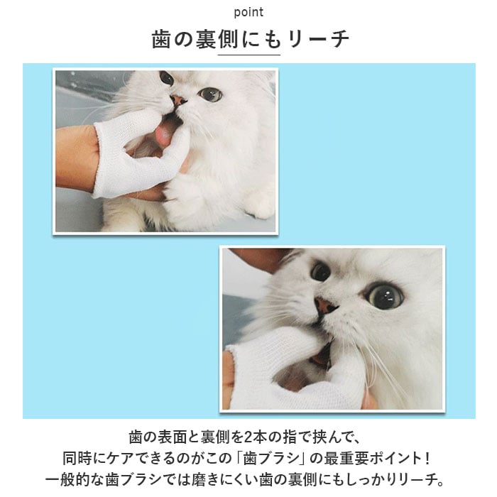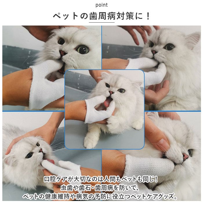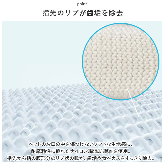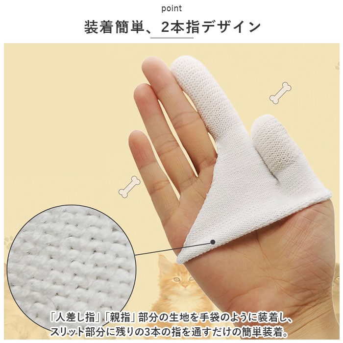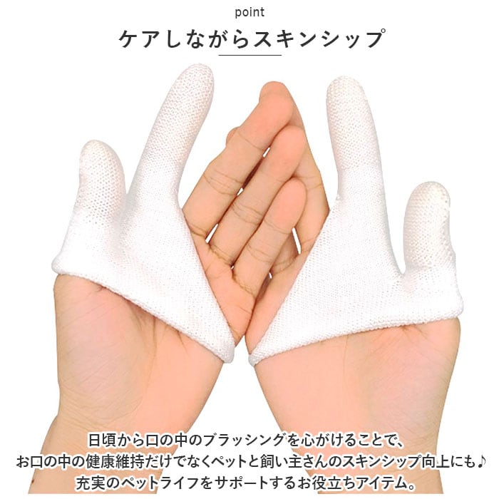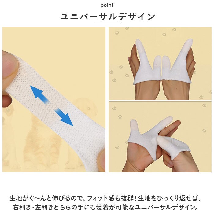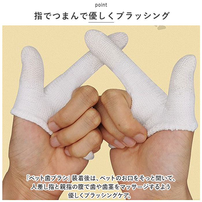 商品説明指先でマッサージしながら、優しくデンタルケア。指サックタイプで使いやすい「ペット用歯ブラシ」が新登場。【ペットの歯周病対策に!】口腔ケアが大切なのは人間もペットも同じ!虫歯や歯石・歯周病を防いで、ペットの健康維持や病気の予防に役立つペットケアグッズ。【装着簡単、2本指デザイン】「人差し指」「親指」部分の生地を手袋のように装着し、スリット部分に残りの3本の指を通すだけの簡単装着。【ユニバーサルデザイン】生地がぐ~んと伸びるので、フィット感も抜群!生地をひっくり返せば、右利き・左利きどちらの手にも装着が可能なユニバーサルデザイン。【指でつまんで優しくブラッシング】・「ペット歯ブラシ」装着後は、ペットのお口をそっと開いて、人差し指と親指の腹で歯や歯茎をマッサージするよう優しくブラッシングケア。【指先のリブが歯垢を除去】ペットのお口の中を傷つけないソフトな生地感に、耐摩耗性に優れたナイロン綿混紡繊維を使用。指先から指の腹部分のリブ状の畝が、歯垢や食べカスをすっきり除去。【歯の裏側にもリーチ】歯の表面と裏側を2本の指で挟んで、同時にケアできるのがこの「歯ブラシ」の最重要ポイント!一般的な歯ブラシでは磨きにくい歯の裏側にもしっかりリーチ。【こまめに洗って再利用可能】ブラッシング後は、やさしく手洗いすることで繰り返し使用することが可能。環境にもお財布にも優しく、とってもエコ。【ケアしながらスキンシップ】日頃から口の中のブラッシングを心がけることで、お口の中の健康維持だけでなくペットと飼い主さんのスキンシップ向上にも♪充実のペットライフをサポートするお役立ちアイテム。