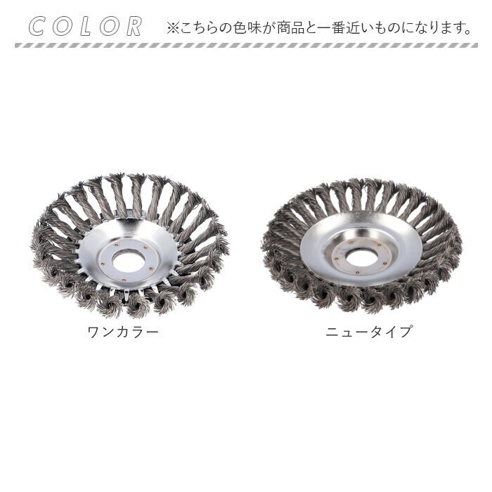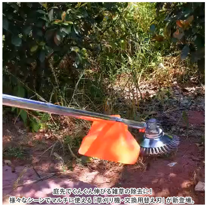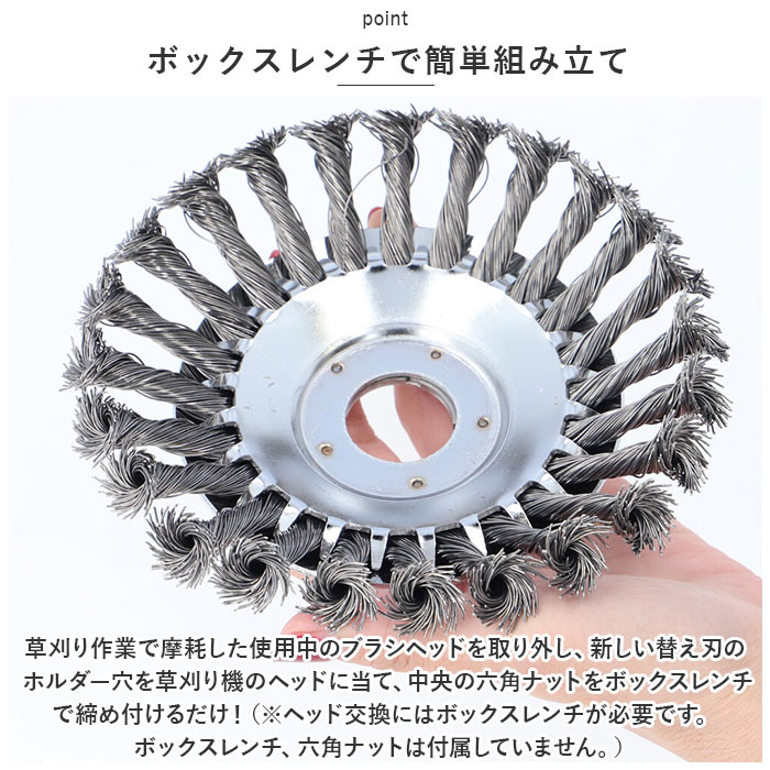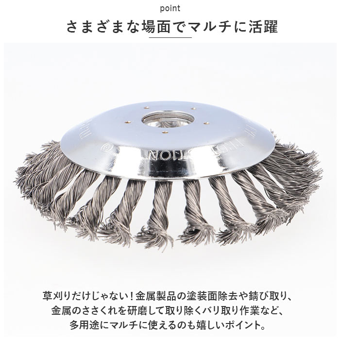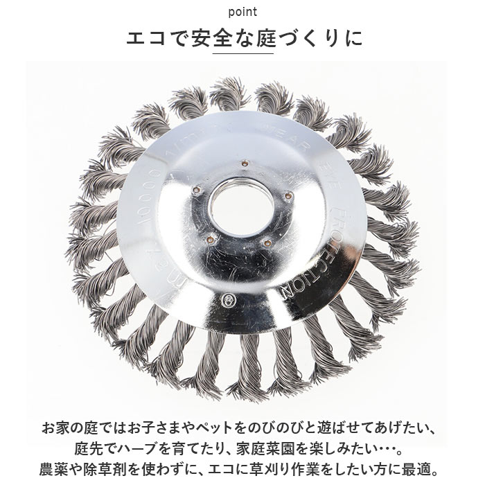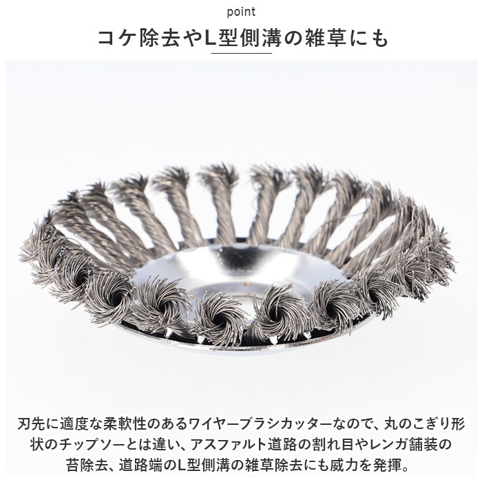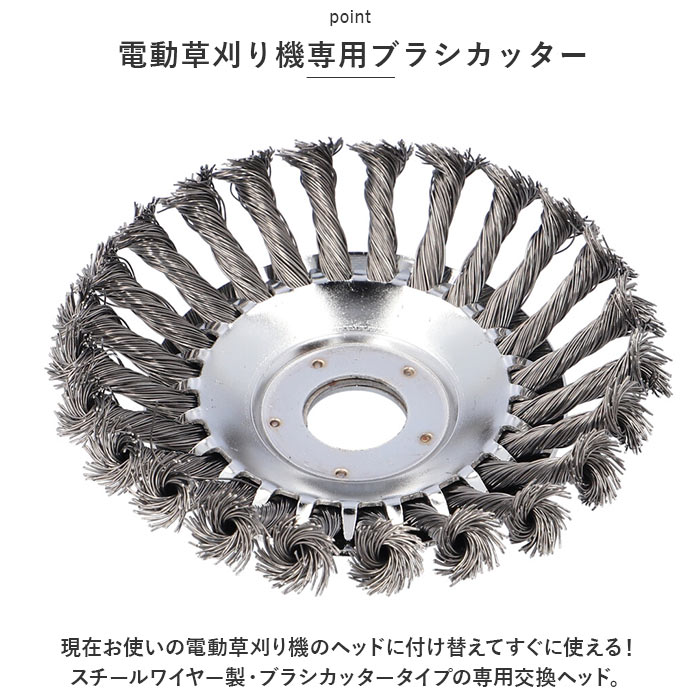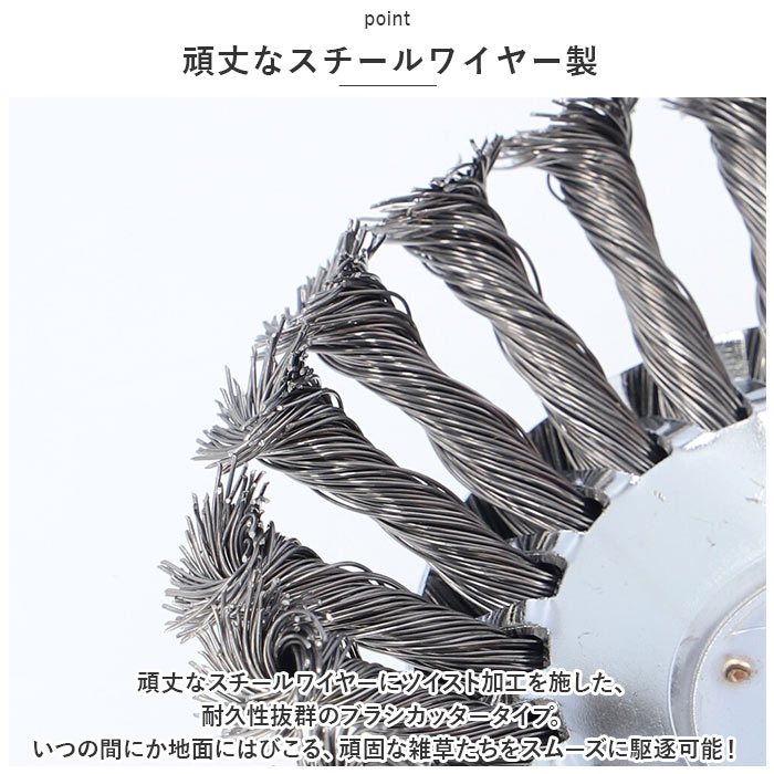 | 商品説明 | 庭先でぐんぐん伸びる雑草の除去に!様々なシーンでマルチに使える「草刈り機・交換用替え刃(6インチタイプ)」が新登場。【電動草刈り機専用ブラシカッター】現在お使いの電動草刈り機のヘッドに付け替えてすぐに使える!スチールワイヤー製・ブラシカッタータイプの専用交換ヘッド。【ボックスレンチで簡単組み立て】草刈り作業で摩耗した使用中のブラシヘッドを取り外し、新しい替え刃のホルダー穴を草刈り機のヘッドに当て、中央の六角ナットをボックスレンチで締め付けるだけ!(※ヘッド交換にはボックスレンチが必要です。ボックスレンチ、六角ナットは付属していません。)【頑丈なスチールワイヤー製】頑丈なスチールワイヤーにツイスト加工を施した、耐久性抜群のブラシカッタータイプ。いつの間にか地面にはびこる、頑固な雑草たちをスムーズに駆逐可能!【コケ除去やL型側溝の雑草にも】刃先に適度な柔軟性のあるワイヤーブラシカッターなので、丸のこぎり形状のチップソーとは違い、アスファルト道路の割れ目やレンガ舗装の苔除去、道路端のL型側溝の雑草除去にも威力を発揮。【さまざまな場面でマルチに活躍】草刈りだけじゃない!金属製品の塗装面除去や錆び取り、金属のささくれを研磨して取り除くバリ取り作業など、多用途にマルチに使えるのも嬉しいポイント。【エコで安全な庭づくりに】お家の庭ではお子さまやペットをのびのびと遊ばせてあげたい、庭先でハーブを育てたり、家庭菜園を楽しみたい・・・。農薬や除草剤を使わずに、エコに草刈り作業をしたい方に最適。 |
