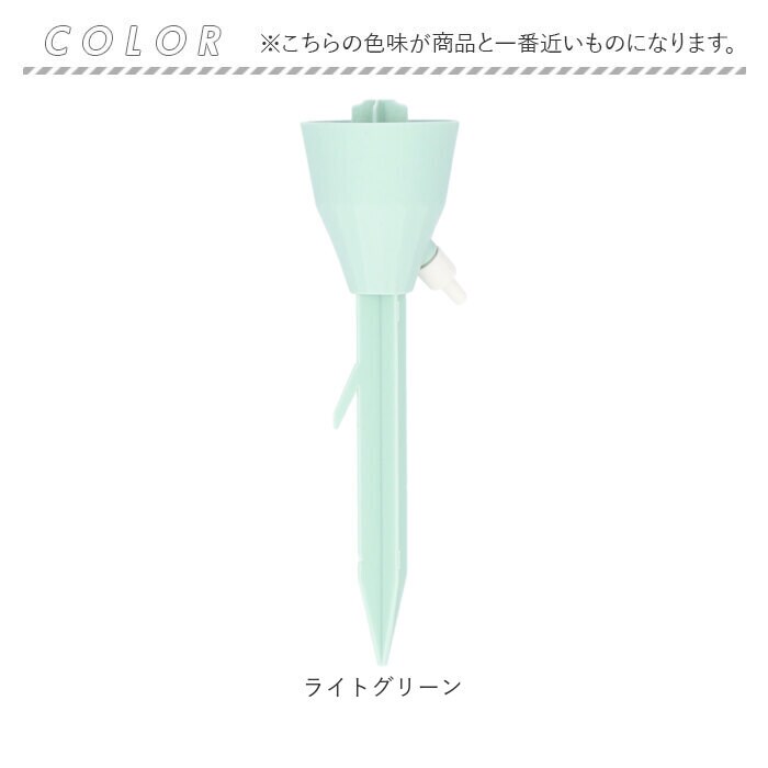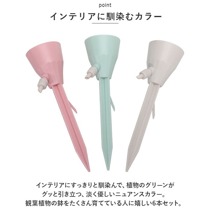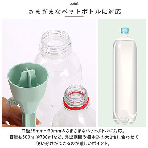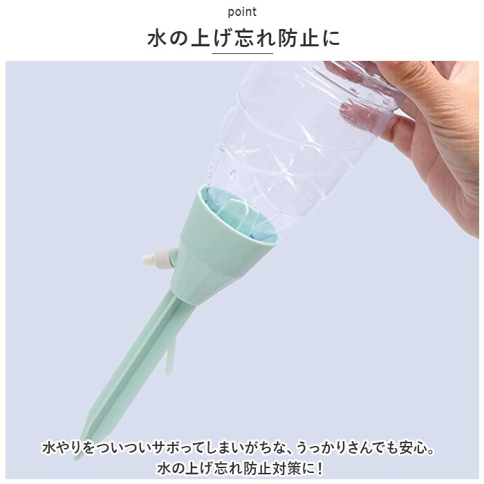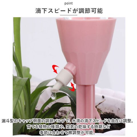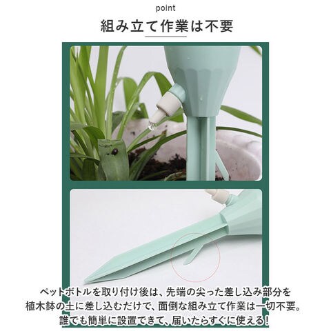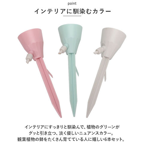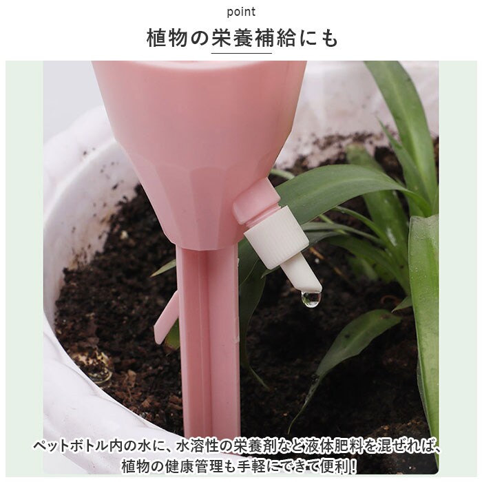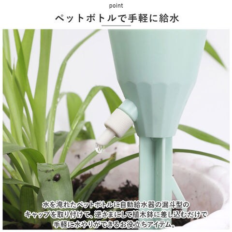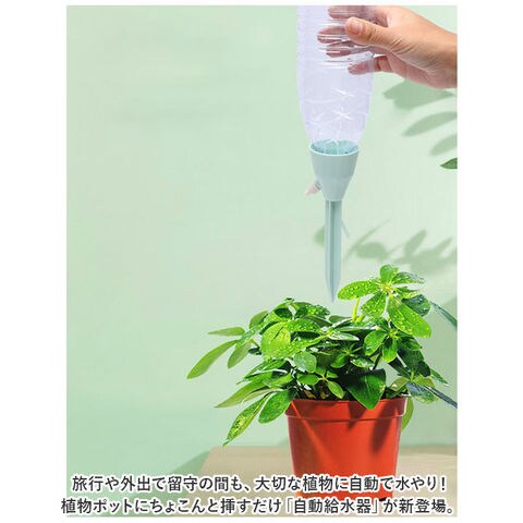 | 商品説明 | 旅行や外出で留守の間も、大切な植物に自動で水やり!植物ポットにちょこんと挿すだけ「自動給水器」が新登場。【ペットボトルで手軽に給水】水を淹れたペットボトルに自動給水器の漏斗型のキャップを取り付けて、逆さまにして植木鉢に差し込むだけで手軽に水やりができるお役立ちアイテム。【さまざまなペットボトルに対応】口径25mm~30mmのさまざまなペットボトルに対応。容量も500mlや700mlなど、外出期間や植木鉢の大きさに合わせて使い分けができるのが嬉しいポイント。【滴下スピードが調節可能】漏斗型のキャップ側面の調節バルブで、水滴の滴下スピードを自在に調整。育てる植物の種類や、空気の乾燥する時期など季節に合わせて微調整が可能。【組み立て作業は不要】ペットボトルを取り付け後は、先端の尖った差し込み部を植木鉢の土に差し込むだけで、面倒な組み立て作業は一切不要。誰でも簡単に設置できて、届いたらすぐに使える!【植物の栄養補給にも】ペットボトル内の水に、水溶性の栄養剤など液体肥料を混ぜれば、植物の健康管理も手軽にできて便利!【水の上げ忘れ防止に】水やりをついついサボってしまいがちな、うっかりさんでも安心。水の上げ忘れ防止対策に!【インテリアに馴染むカラー】インテリアにすっきりと馴染んで、植物のグリーンがグッと引き立つ、淡く優しいニュアンスカラー。観葉植物の鉢をたくさん育てている人に嬉しい6本セット。 |