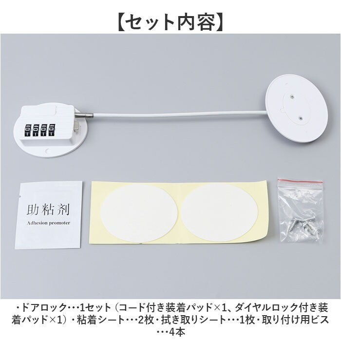 | 注意点 | 【セット内容】・ドアロック・・・1セット(コード付き装着パッド×1、ダイヤルロック付き装着パッド×1)・粘着シート・・・2枚・拭き取りシート・・・1枚・取り付け用ビス・・・4本海外輸入品のため、商品によってはパッケージや説明書が、英語や中国語表記となっている場合があります。商品を安価でご提供させていただくため、輸入時のパッケージのままでのお届けとなります。予めご了承くださいませ。海外輸入品のため、パッケージに破れ、傷やへこみがある場合がございます。本体には問題ございませんので、予めご了承くださいませ。商品の写真はできる限り実物のお色に近づけるように加工しておりますが、お使いのモニター設定、お部屋の照明などにより、実際の商品と異なる場合がございます。商品や個体差などにより、表記と若干異なる場合がございますが、予めご了承くださいませ。採寸方法の違いにより、多少の誤差がある場合がございます。こちらの商品本体、及び商品についている印字やタグに関しては、海外メーカー独自のサイズ情報や表記になります。実際には、当社にて日本向けに正しい情報をページに掲載させて頂いております。 |