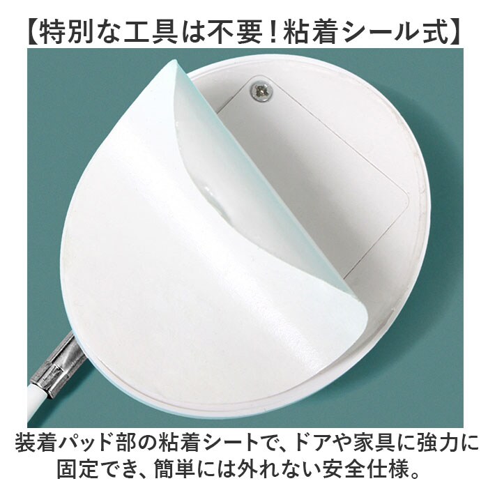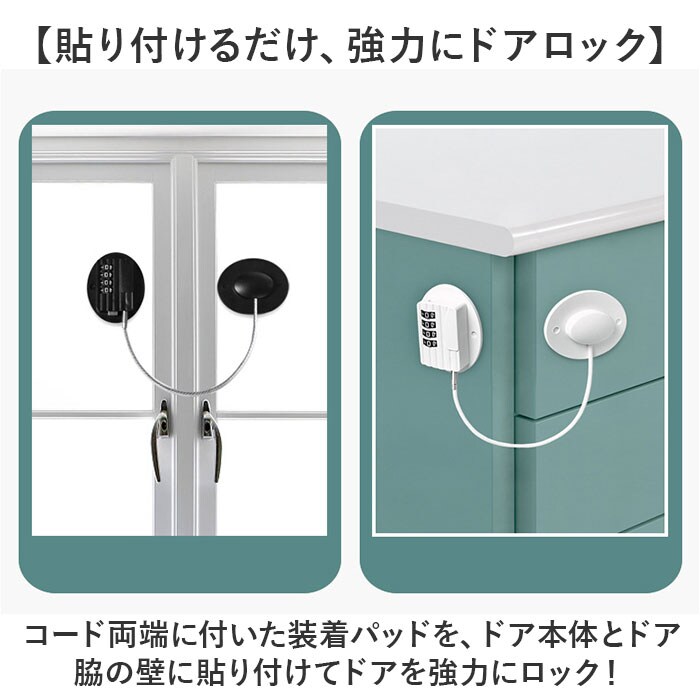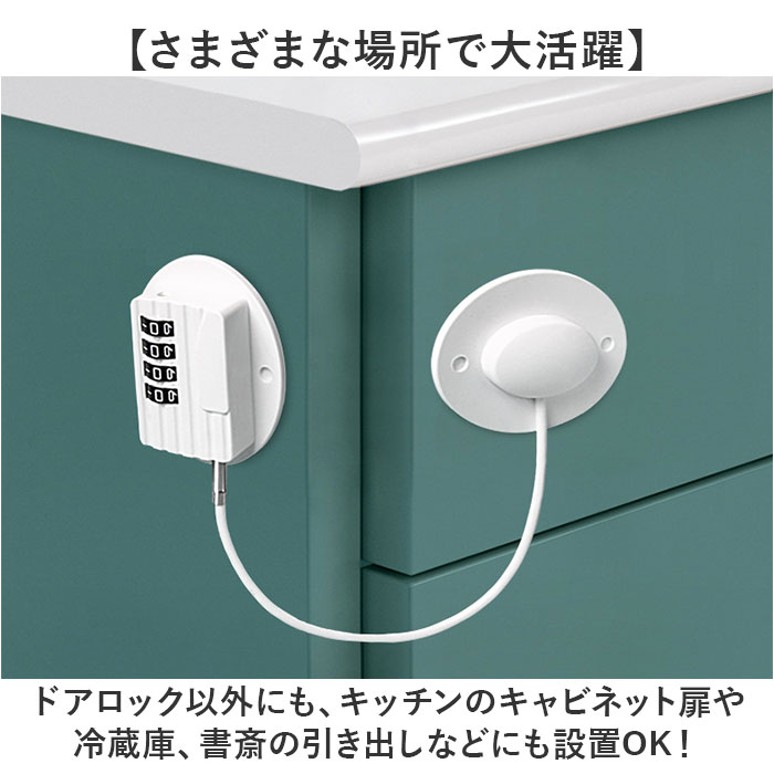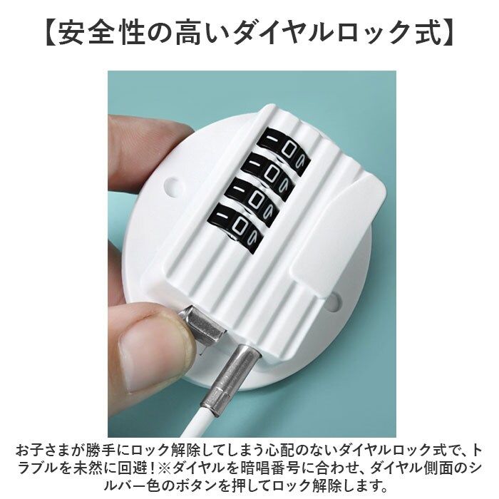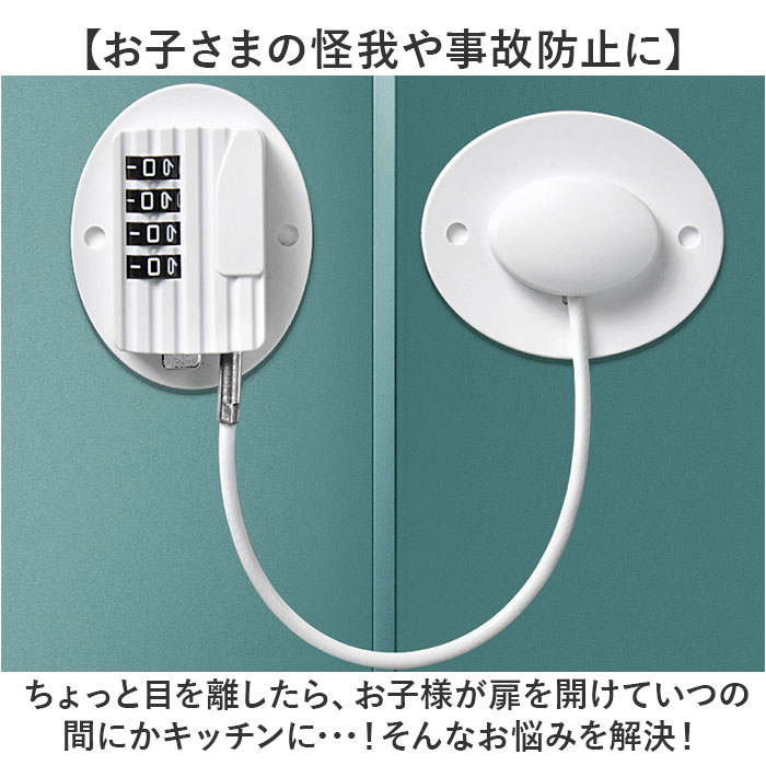 | 商品説明 | 【お子さまやペットのいたずら防止に】お家の中での予期せぬ事故を防ぐ!貼るだけで取り付け簡単「ダイヤル式ドアロック」が新登場。【お子さまの怪我や事故防止に】ちょっと目を離したら、お子様が扉を開けていつの間にかキッチンに・・・!そんなお悩みを解決!【貼り付けるだけ、強力にドアロック】コード両端に付いた装着パッドを、ドア本体とドア脇の壁に貼り付けてドアを強力にロック!【簡単に切断できない丈夫なコード】ワイヤーハサミでも切断の不可能な、耐久性の高い直径3mmのステンレスワイヤーを採用。【特別な工具は不要!粘着シール式】装着パッド部の粘着シートで、ドアや家具に強力に固定でき、簡単には外れない安全仕様。【安全性の高いダイヤルロック式】お子さまが勝手にロック解除してしまう心配のないダイヤルロック式で、トラブルを未然に回避!※ダイヤルを暗唱番号に合わせ、ダイヤル側面のシルバー色のボタンを押してロック解除します。【お好みの暗唱番号に設定可能】ダイヤルボックス側面のリセットボタンを長押ししながら、お好みの番号に暗唱番号が設定可能。※商品出荷時の初期状態では、暗証番号は「0000」に設定されています。【さまざまな場所で大活躍】ドアロック以外にも、キッチンのキャビネット扉や冷蔵庫、書斎の引き出しなどにも設置OK!【ペットのいたずら対策にも】お子さまの自宅内での事故防止にはもちろん、ペットのいたずら防止や脱走防止対策にも効果的。【取り付けは簡単・3ステップ】1.付属の拭き取りシートで、設置したいドアや壁面の汚れやホコリを取り除いておく。2.コード両端の楕円形の装着パッドに、剥離シートをはがした粘着テープを貼り付ける。3.コードの長さを調節しながら、装着パッドをドア本体やドア枠などの建具に貼り付けて完成!※ドアロックをより確実に設置したい方のために、取り付け用のビスが4本付属しています。 |