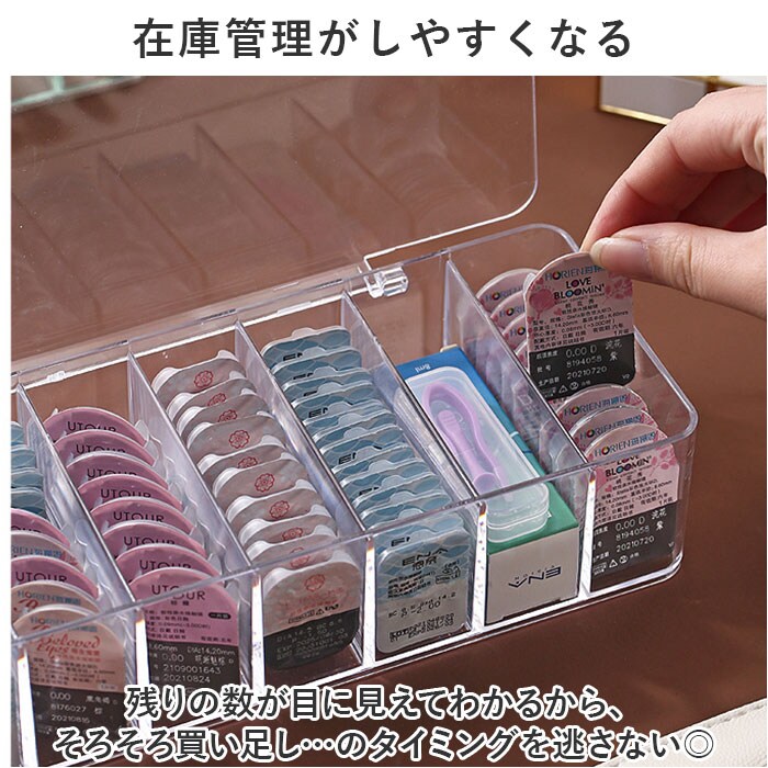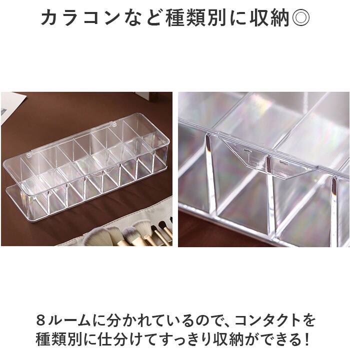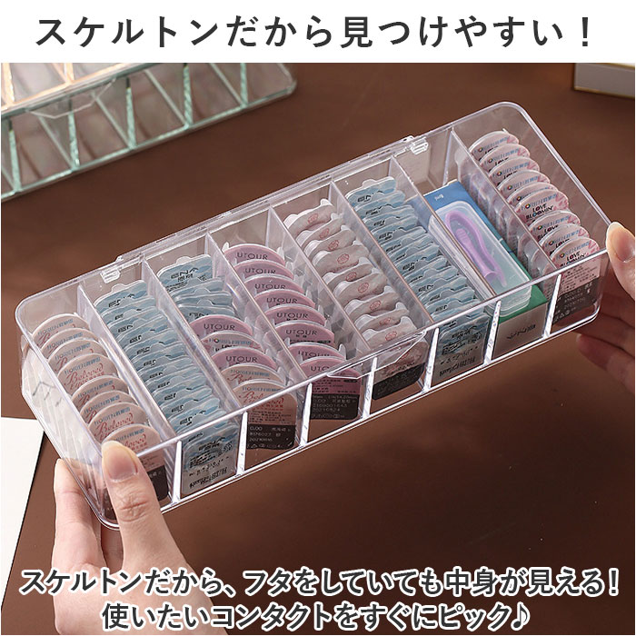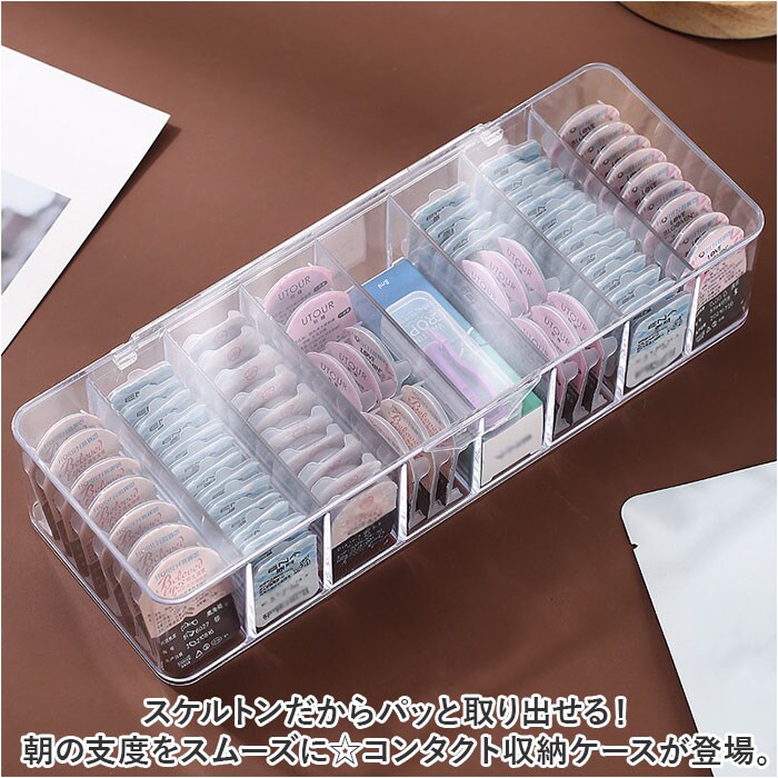 | 商品説明 | スケルトンだからパッと取り出せる!朝の支度をスムーズに☆コンタクト収納ケースが登場。【バタつく朝のお支度がスムーズに】ゴチャつきがちなコンタクトを整理整頓できるから、毎朝の支度がスムーズに!お部屋も片付く☆【カラコンなど種類別に収納◎】8ルームに分かれているので、コンタクトを種類別に仕分けてすっきり収納ができる!【スケルトンだから見つけやすい!】スケルトンだから、フタをしていても中身が見える!使いたいコンタクトをすぐにピック♪【在庫管理がしやすくなる】残りの数が目に見えてわかるから、そろそろ買い足し…のタイミングを逃さない◎【もちろんコンタクト以外にも♪】電源アダプタなどの収納、アクセサリー収納、メイク道具や文具の収納など使い方は無限大! |