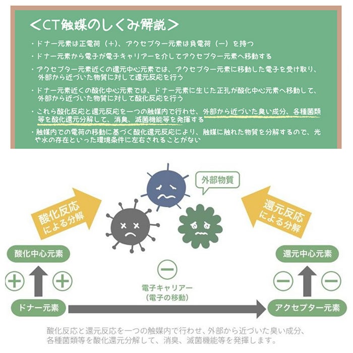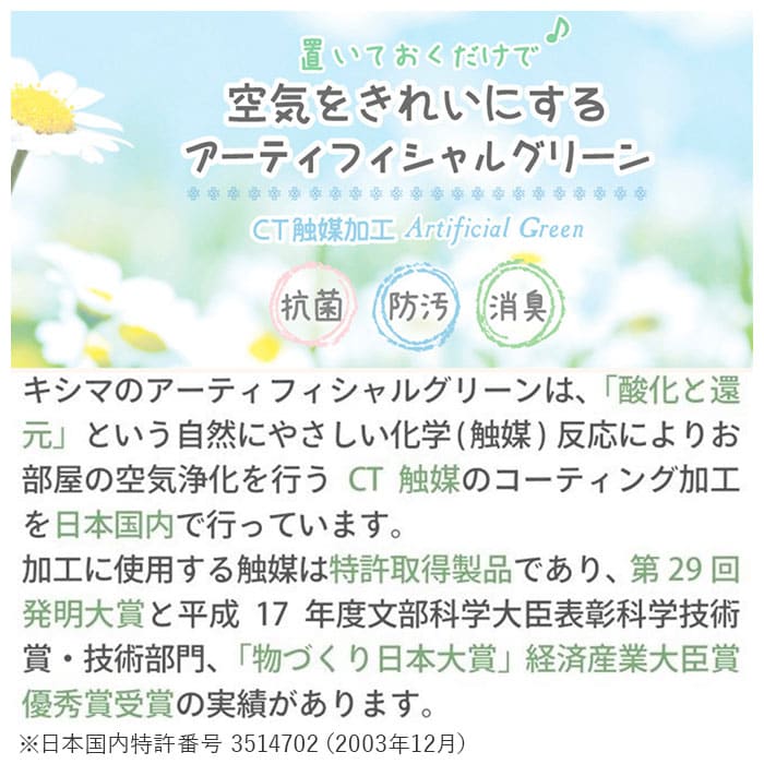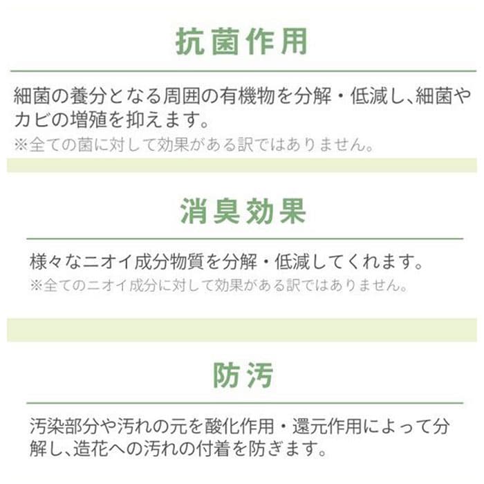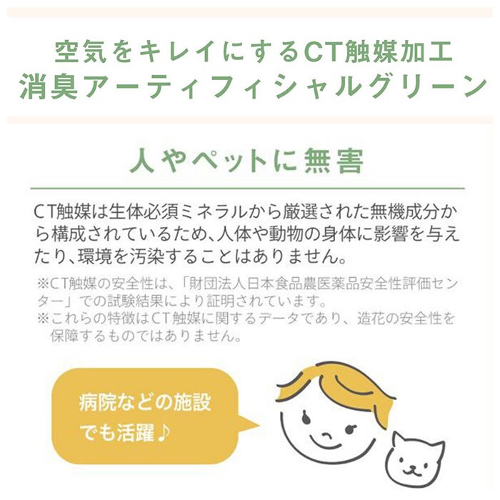 | 注意点 | 造花の素材はポリエステルや塩化ビニールなので、火気またはスポットライト等の高温になる物からなるべく遠ざけるようにして下さい。火災や変形の恐れがあります。葉や花びらの表面にホコリがたまりすぎるとCT触媒が空気に触れにくくなりますので、定期的なお手入れが必要です。本体のホコリ等を取り除く際は、はたきや柔らかく乾いた布で優しく払い取って下さい。また特に汚れがひどい場合は固く絞った布で静かに拭き取とるようにして下さい。その際に強くこすりすぎますと、CT触媒コーティングが剥がれて効果が損なわれる恐れがありますのでご注意下さい。CT触媒のコーティング加工により、葉や花びらの表面に白色の微細な粒子が見られる場合がありますが、品質に問題はありません。気になる場合は柔らかく乾いた布で表面を優しく拭き取って下さい。(白色の粒子が目に見えなくなっても、触媒作用が弱まることはありません。)製品は屋内装飾用のため、屋外では使用しないで下さい。また屋内の直射日光の当たる場所も避けて下さい。紫外線の影響で退色が早まる場合があります。印刷や塗装、染色が施してある製品は水や摩擦によって色落ちする場合があります。お子様やペットの手が届かない場所で使用して下さい。CT触媒自体は無害ですが造花は装飾用に作られているため、食品に直に触れる様な使い方をしたり、直接口に入れたりしないようにして下さい。茎の内部にワイヤーが入っている製品において、過度に力を加えたり何度も同じ箇所で曲げたりしないで下さい。内部のワイヤーが折れたり外に突き出したりする恐れがあります。カメラやモニターの性質により、画像と実物の色の違いがある場合がございますのでご理解願います。 |