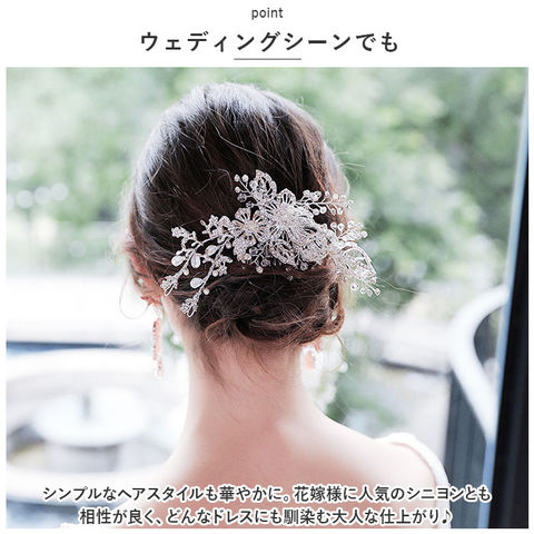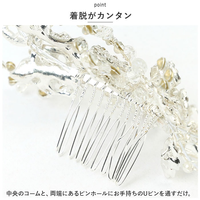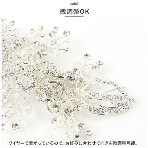 | 商品説明 | ヘアアレンジにアクセントをプラス♪上品なスタイルを作り出す、ヘッドアクセサリーが登場。【存在感のあるフラワー&リーフデザイン】キラッと光るビジューやイミテーションパールが印象的。目を惹く大ぶりのフォルムで、アップスタイルにもダウンスタイルにもマッチ☆【着脱がカンタン】中央のコームと、両端にあるピンホールにお手持ちのUピンを通すだけ。【微調整OK】ワイヤーで繋がっているので、お好みに合わせて向きを微調整可能。【ウェディングシーンでも】シンプルなヘアスタイルも華やかに。花嫁様に人気のシニヨンとも相性が良く、どんなドレスにも馴染む大人な仕上がり♪ |