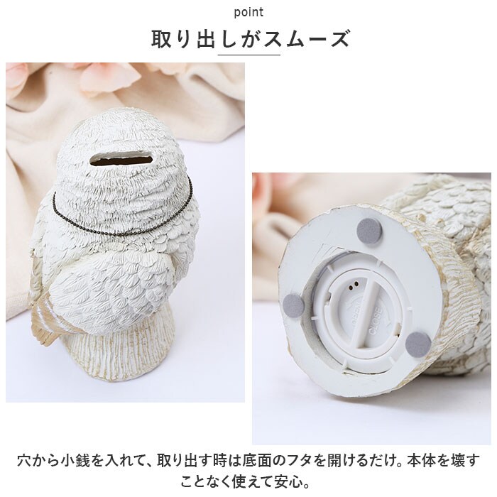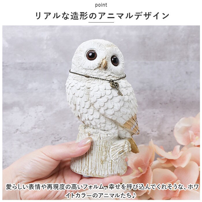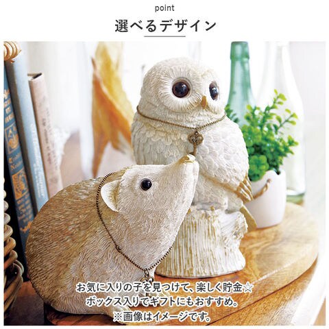 | 商品説明 | まるで本物のアニマル♪置いておくだけで絵になる「ホワイトアニマル貯金箱」が新登場。【リアルな造形のアニマルデザイン】愛らしい表情や再現度の高いフォルム。幸せを呼び込んでくれそうな、ホワイトカラーのアニマルたち♪【取り出しがスムーズ】穴から小銭を入れて、取り出す時は底面のフタを開けるだけ。本体を壊すことなく使えて安心。【オブジェとしても活躍】置いておくだけで、パッとおしゃれな空間に。リビングなどのインテリアとしても楽しめちゃう!【選べるデザイン】お気に入りの子を見つけて、楽しく貯金☆ボックス入りでギフトにもおすすめ。 |