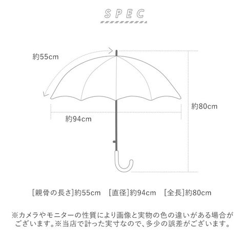 | サイズ | [親骨の長さ]約55cm/[直径]約94cm/[全長]約80cm ※サイズは当店計測の実寸サイズです。実際の商品ならびにメーカー表記サイズとは多少の誤差が生じる場合がございます。あらかじめご了承ください。 |