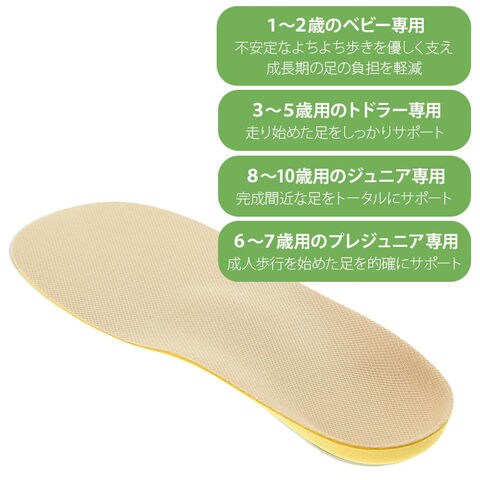 | 商品説明 | ベビー~キッズ専用のインソール。お子様の発達する足骨格のアーチ構造をサポート。骨格の形状が完成する10歳までのお子様の成長段階にあわせ、4種類のサイズ。お得な2足入り。1~2歳のベビー専用は不安定なよちよち歩きを優しく支え、成長期の足の負担を軽減。3~5歳用のトドラー専用は走り始めた足をしっかりサポート。6~7歳用のプレジュニア専用は成人歩行を始めた足を的確にサポート。8~10歳用のジュニア専用は完成間近な足をトータルにサポート。かかとのぐらつきを抑えるヒールカップ形状。サイズ調整用のインソールで少し大きめの靴でも大丈夫!お気に入りの靴を少しでも長く履ける。抗菌防臭加工で清潔。 |
