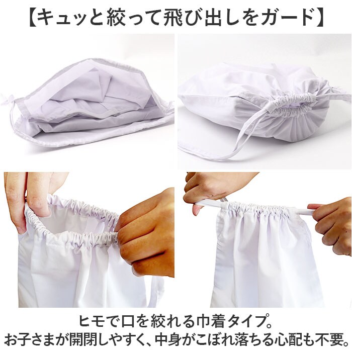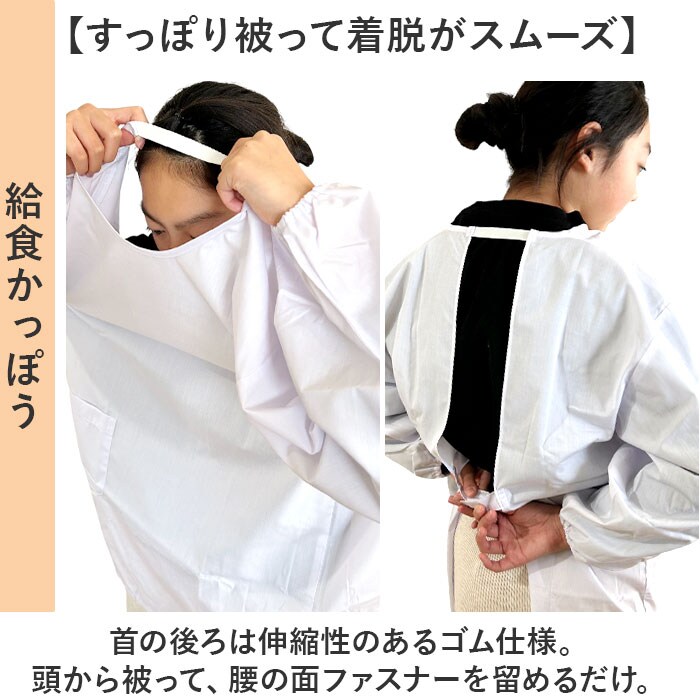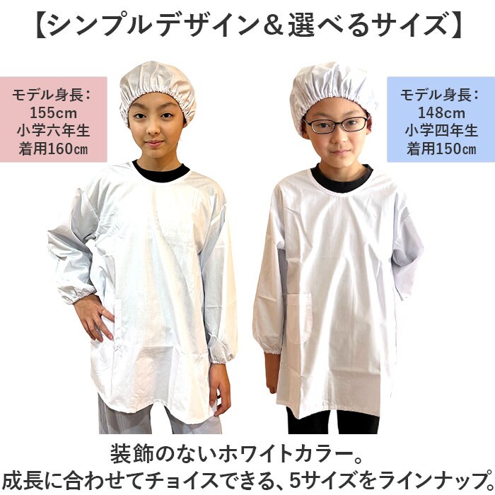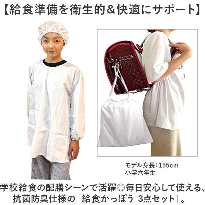 | 商品説明 | 【給食準備を衛生的&快適にサポート】学校給食の配膳シーンに!毎日安心して使える、抗菌防臭仕様の「給食かっぽう 3点セット」。【すっきりまとめてスマートに】かっぽう着と帽子を、給食袋にひとまとめ。バラバラにならず、持ち帰りもラクラク。【抗菌防臭加工でいつも清潔をキープ】繊維上の細菌増殖を抑制し、防臭効果を示す”ピーチフレッシュ生地”を採用。【ピーチフレッシュの特徴】風合いはそのままに、ニオイを元からストップして効果が持続。安全性の高さもポイント。【デイリー使いに最適なシンプルさ】装飾のないホワイトカラー。給食かっぽうは、成長に合わせてチョイスできる5サイズ。《給食かっぽう》【すっぽり被って着脱がスムーズ】首の後ろは伸縮性のあるゴム仕様。頭から被って、腰の面ファスナーを留めるだけ。【手首にフィットして動きを妨げない】袖口にはギャザーゴム入り。手元がダボつくことなく、腕まくりもカンタン!【ハンカチ等を入れておけるポケット】右側にミニポケットを配置。薄手のハンカチをINしておけば、手洗いの際にも便利。《給食帽子》【優しくフィットしてストレスフリー】ぐるっと360度ギャザーゴム入り。伸縮性があり頭の形に馴染んでまとめた髪もすっきりイン。《給食袋》【キュッと絞って飛び出しをガード】ヒモで口を絞れる巾着タイプ。お子さまが開閉しやすく、中身がこぼれ落ちる心配も不要。 |