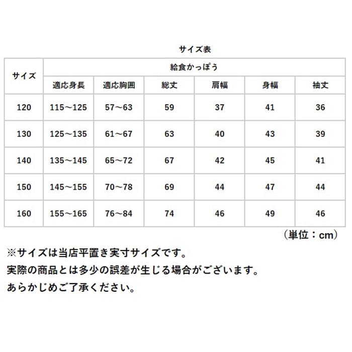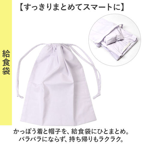 | 重量 | [給食かっぽう]約145g(※140cmサイズの商品の重量です。) [給食帽子]約23g [給食袋]約33g |