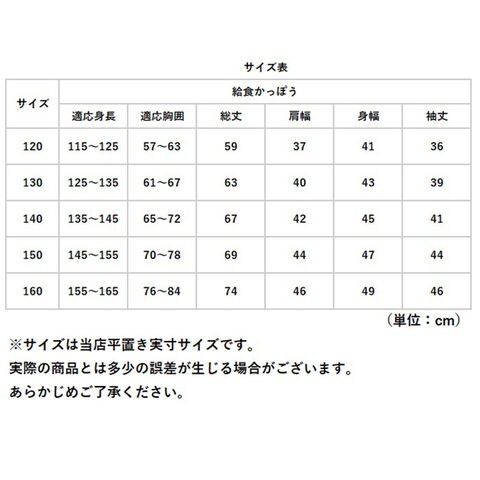 | 注意点 | [給食かっぽう]洗濯機 可 乾燥機 不可長時間日光にあたったり、摩擦、水漏れなどによる色落ちや色移りすることがあります。お取り扱いの際は、商品やパッケージなどに記載されている品質表示、アテンションタグ、ご使用上の注意事項などを必ずご確認下さい。本来の目的以外にはご使用にならないで下さい。カメラやモニターの性質により、画像と実物の色の違いがある場合がございますのでご理解願います。 |