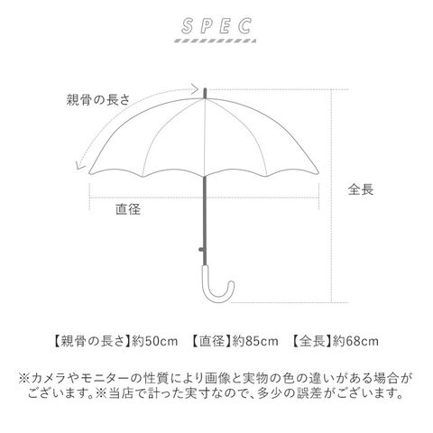 | サイズ | [親骨の長さ]約50cm/[直径]約85cm/[全長]約68cm ※サイズは当店計測の実寸サイズです。実際の商品ならびにメーカー表記サイズとは多少の誤差が生じる場合がございます。あらかじめご了承ください。 |