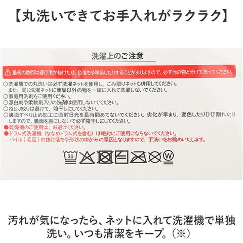 | 注意点 | 洗濯機 可(ドラム式洗濯機、ななめドラム式は不可)ドライクリーニング 不可乾燥機 不可長時間日光にあたったり、摩擦、水漏れなどによる色落ちや色移りすることがあります。お取り扱いの際は、商品やパッケージなどに記載されている品質表示、アテンションタグ、ご使用上の注意事項などを必ずご確認下さい。本来の目的以外にはご使用にならないで下さい。カメラやモニターの性質により、画像と実物の色の違いがある場合がございますのでご理解願います。 |