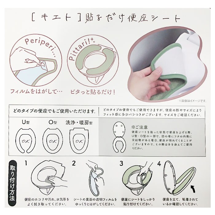| 商品説明 | 【ペタッと貼るだけ】やわらかな色味とでシンプルなデザインのkietoシリーズから便座シートが新発売。【ピタッと貼れる】裏面の透明フィルムをはがし、便座に装着。面倒な手間不要で、便座を持ち上げてもズレない!【色んなタイプの便座に対応】U型、O型、洗浄・暖房型どのタイプの便座にも使用可能。引っ越しの際も買い替えいらず。【柔らかな座り心地】クッションタイプなので長時間座っていても、お尻が痛くなりにくい◎【冬もお尻が冷たくならない】厚手のクッションと起毛素材で冬も座った時にお尻に伝わる冷たさを軽減。【可愛い見た目がGOOD】起毛仕上げでもこもこした見た目が可愛く、ずっと触りたくなる心地よさ◎【ニオイを抑える抗菌防臭】抗菌防臭加工を施し、気になるニオイを発生する菌の繁殖をおさえニオイを少なく。【丸洗いできてお手入れラクラク】汚れが気になったら、ネットに入れて洗濯機洗いOK。いつも清潔をキープ。(※)洗濯機の弱モード使用、タンブラー乾燥は避けてください。【kieto】やわらかな色味とシンプルなデザインが特徴のトイレタリーシリーズ。 |