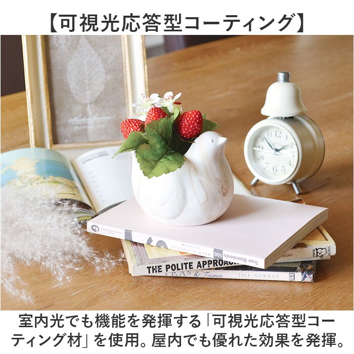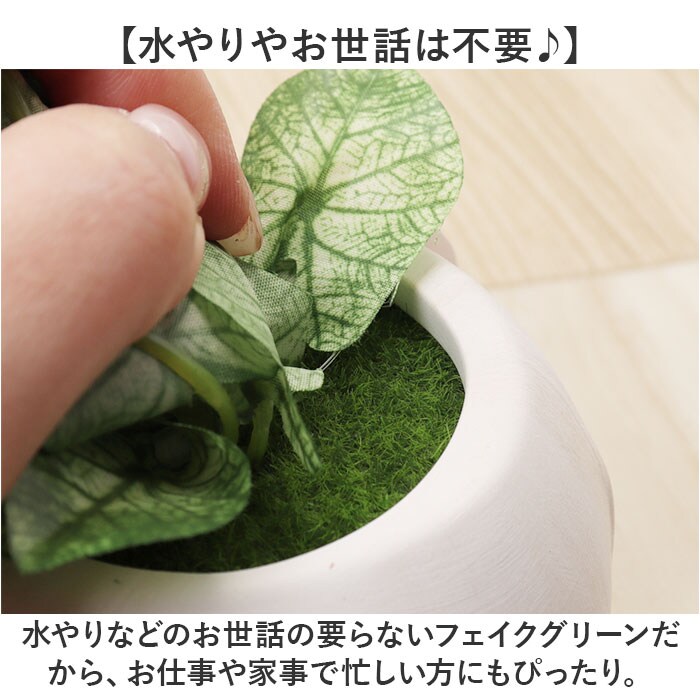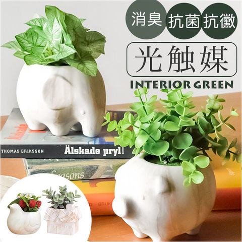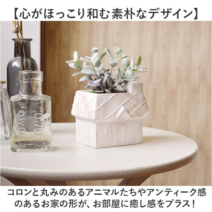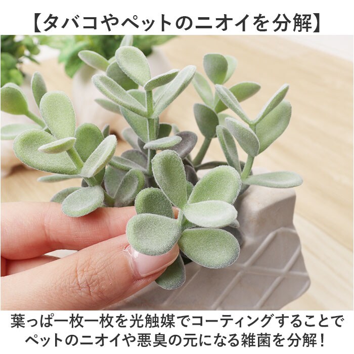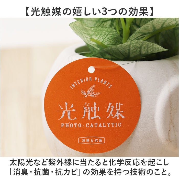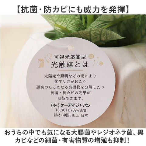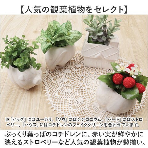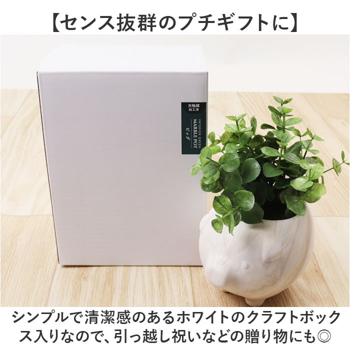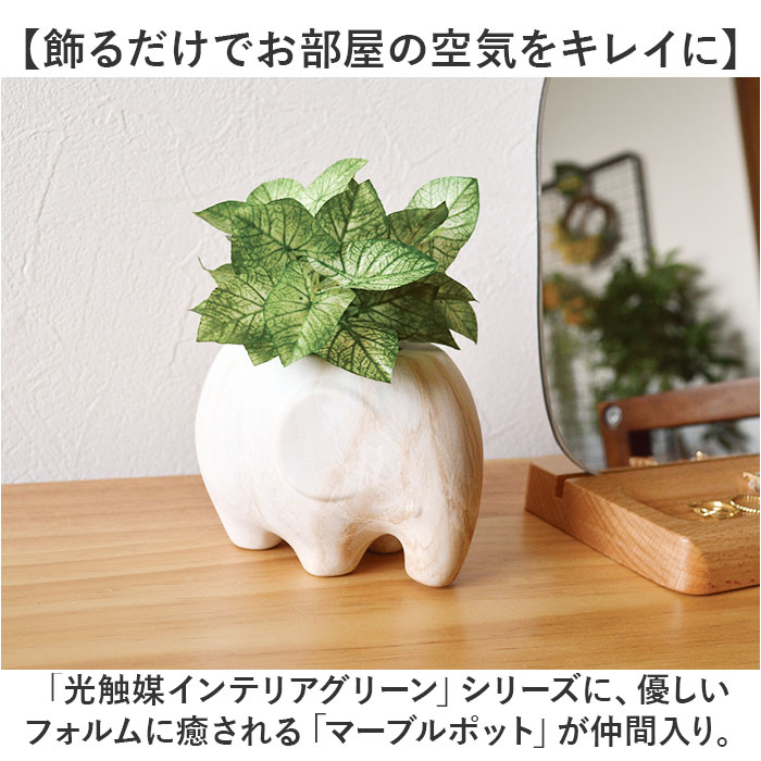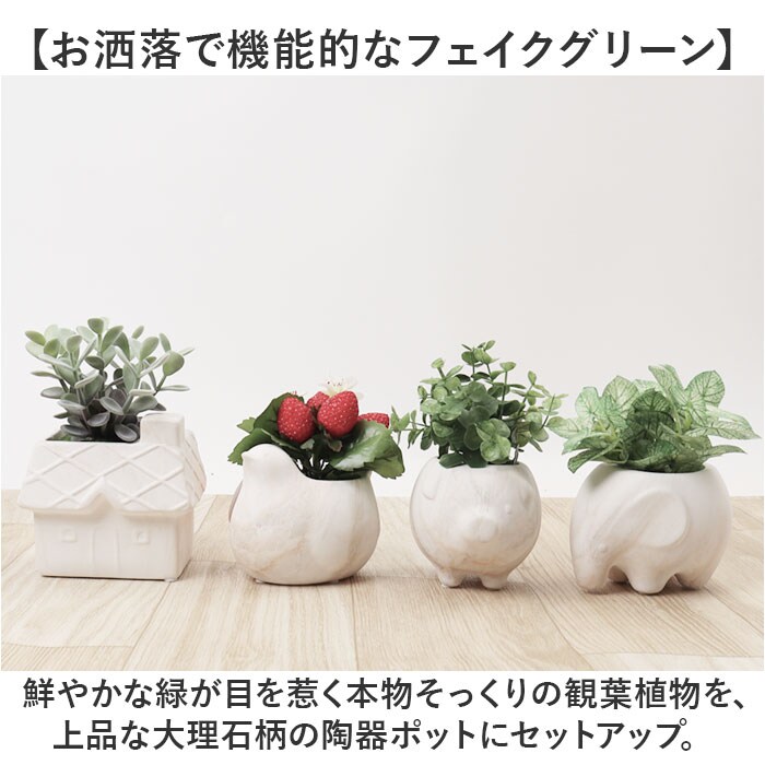 | 商品説明 | 【飾るだけでお部屋の空気をキレイに】・「光触媒インテリアグリーン」シリーズに、優しいフォルムに癒される「マーブルポット」が仲間入り。【お洒落で機能的なフェイクグリーン】鮮やかな緑が目を惹く本物そっくりの観葉植物を、上品な大理石柄の陶器ポットにセットアップ。【光触媒の嬉しい3つの効果】太陽光など紫外線に当たると化学反応を起こし「消臭・抗菌・抗カビ」の効果を持つ技術のこと。【タバコやペットのニオイを分解】葉っぱ一枚一枚を光触媒でコーティングすることでペットのニオイや悪臭の元になる雑菌を分解!【抗菌・防カビにも威力を発揮】おうちの中でも気になる大腸菌やレジオネラ菌、黒カビなどの細菌・有害物質の増殖も抑制!【可視光応答型コーティング】室内光でも機能を発揮する「可視光応答型コーティング材」を使用。屋内でも優れた効果を発揮。【水やりやお世話は不要♪】水やりなどのお世話の要らないフェイクグリーンだから、お仕事や家事で忙しい方にもぴったり。【安定感のあるセラミックポット】程よい重みで倒れにくい陶器製ポットに、底面には滑り止めフェルト付きなのでどこに飾っても安心。【心がほっこり和む素朴なデザイン】コロンと丸みのあるアニマルたちやアンティーク感のあるお家の形が、お部屋に癒し感をプラス!【人気の観葉植物をセレクト】ぷっくり葉っぱのコチドレンに、赤い実が鮮やかに映えるストロベリーなど人気の観葉植物が勢揃い。※「ピッグ」にはユーカリ、「ゾウ」にはシンゴニウム、「バード」にはストロベリー、「ハウス」にはコチドレンのフェイクグリーンを合わせています。【センス抜群のプチギフトに】シンプルで清潔感のあるホワイトのクラフトボックス入りなので、引っ越し祝いなどの贈り物にも◎ |