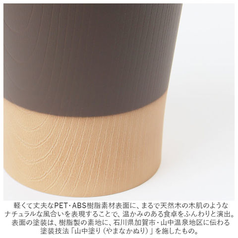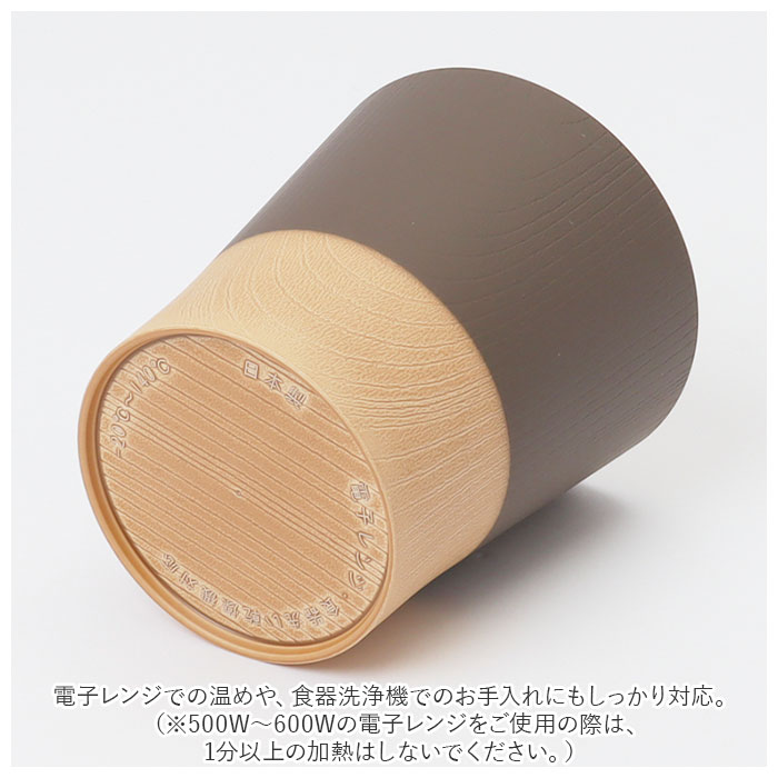 | 商品説明 | ナチュラルな木目の風合いと日本伝統の色合いが奏でるハーモニー。「やさしい彩り」シリーズに、「抗菌・湯のみ」が仲間入り。「やさしい彩り」シリーズは、明るい木目調の樹脂素材を日本古来の風雅な色彩で仕上げた和食にも洋食にも映えるテーブルウェア。お茶やコーヒーはもちろん、お酒を楽しみたいときにもちょうどいい、両手のひら包みこめる程のサイズ感。軽くて丈夫なPET・ABS樹脂素材表面に、まるで天然木の木肌のようなナチュラルな風合いを表現することで、温かみのある食卓をふんわりと演出。湯のみやカップとしてだけでなく、野菜スティックやデザートを盛り付けるなどアレンジも自由自在!電子レンジでの温めや、食器洗浄機でのお手入れにもしっかり対応。さらに、いつでも清潔に使える抗菌仕様の塗装を施しているので、毎日の家事に忙しいママさんの強い味方!(※500W~600Wの電子レンジをご使用の際は、1分以上の加熱はしないでください。)カチッと重ねてスタッキング収納ができるから、食器棚でも場所を取らずに省スペース♪表面の塗装は、樹脂製の素地に、石川県加賀市・山中温泉地区に伝わる塗装技法「山中塗り(やまなかぬり)」を施したもの。瑠璃(るり)・茜(あかね)・鶯(うぐいす)など、昔ながらの日本の情緒を感じさせる優しいカラーリングも魅力のひとつ。安心の日本製品。 |