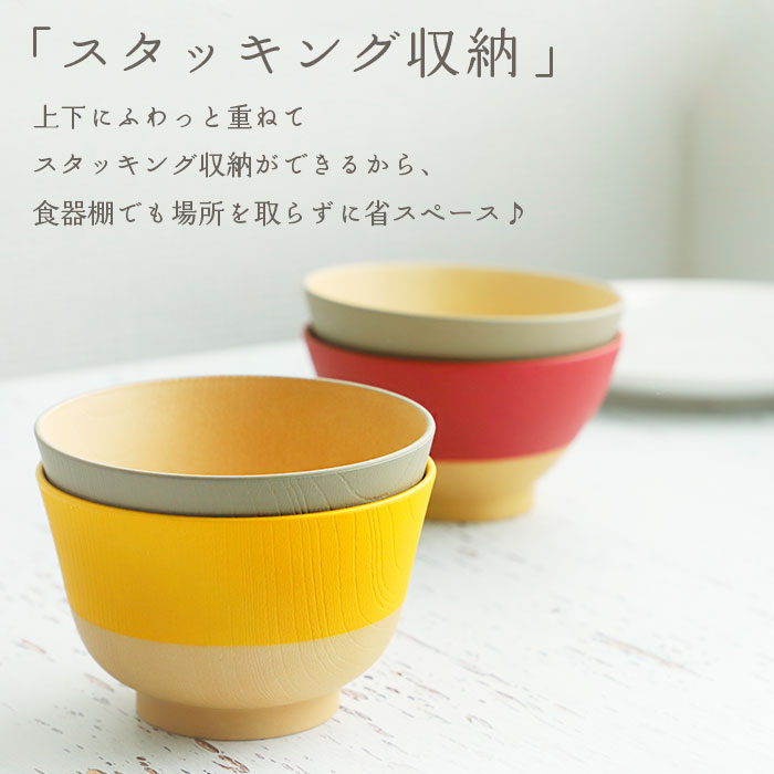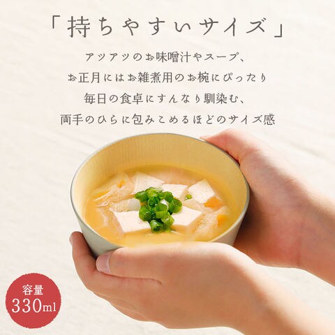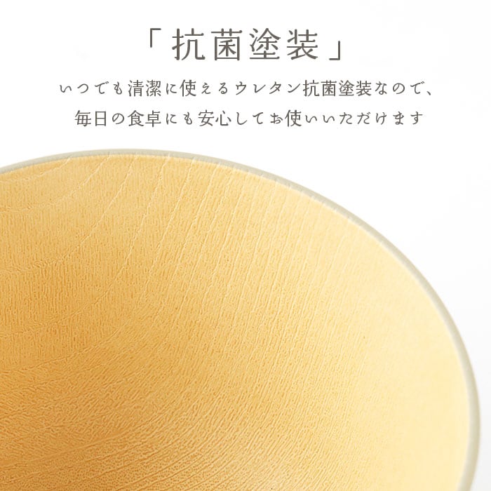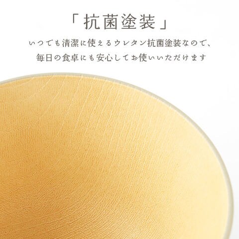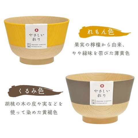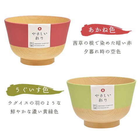 | 商品説明 | ナチュラルな木目の風合いと日本伝統の色合いが奏でるハーモニー。「やさしい彩り」シリーズに、「抗菌・飯椀」が仲間入り。「やさしい彩り」シリーズは、明るい木目調の樹脂素材を日本古来の風雅な色彩で仕上げた和食にも洋食にも映えるテーブルウェア。アツアツのお味噌汁や豚汁、お正月にはお雑煮用のお椀にぴったり。毎日の食卓にすんなり馴染む、両手のひらに包みこめるほどのサイズ感。軽くて丈夫なPET・ABS樹脂素材表面に、まるで天然木の木肌のようなナチュラルな風合いを表現することで、温かみのある食卓をふんわりと演出。電子レンジでの温めや、食器洗浄機でのお手入れにもしっかり対応。さらに、いつでも清潔に使える抗菌仕様の塗装を施しているので、毎日の家事に忙しいママさんの強い味方!(※500W~600Wの電子レンジをご使用の際は、1分以上の加熱はしないでください。)上下にふわっと重ねてスタッキング収納ができるから、食器棚でも場所を取らずに省スペース♪同じ「やさしい彩り」シリーズの飯椀(商品コード:kindmeshiwan)と揃えて、ダイニングテーブルをもっと素敵にコーディネート♪表面の塗装は、樹脂製の素地に、石川県加賀市・山中温泉地区に伝わる塗装技法「山中塗り(やまなかぬり)」を施したもの。瑠璃(るり)・茜(あかね)・鶯(うぐいす)など、昔ながらの日本の情緒を感じさせる優しいカラーリングも魅力のひとつ。安心の日本製品。 |