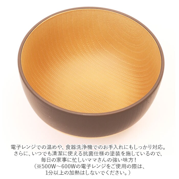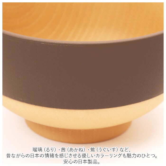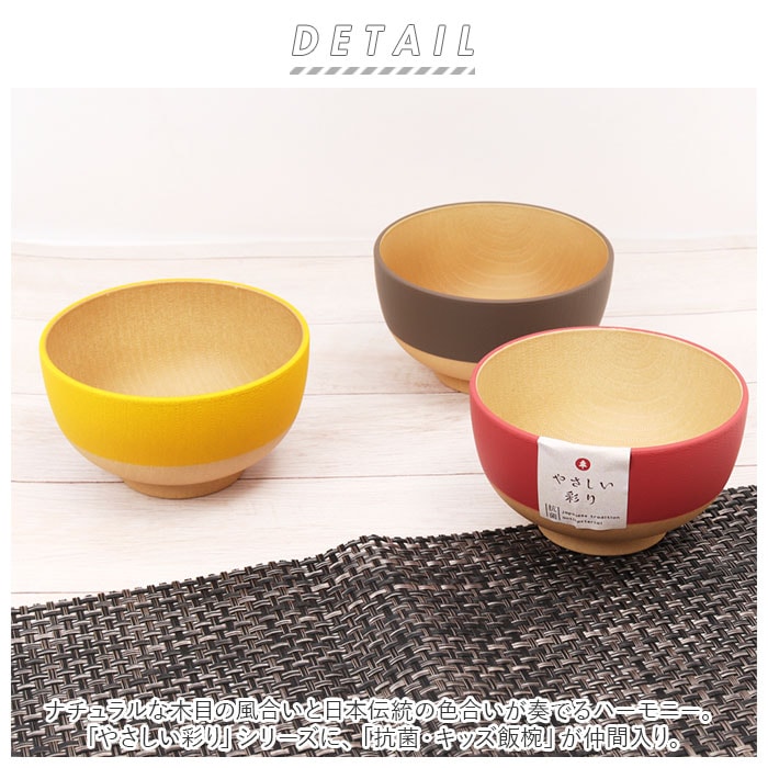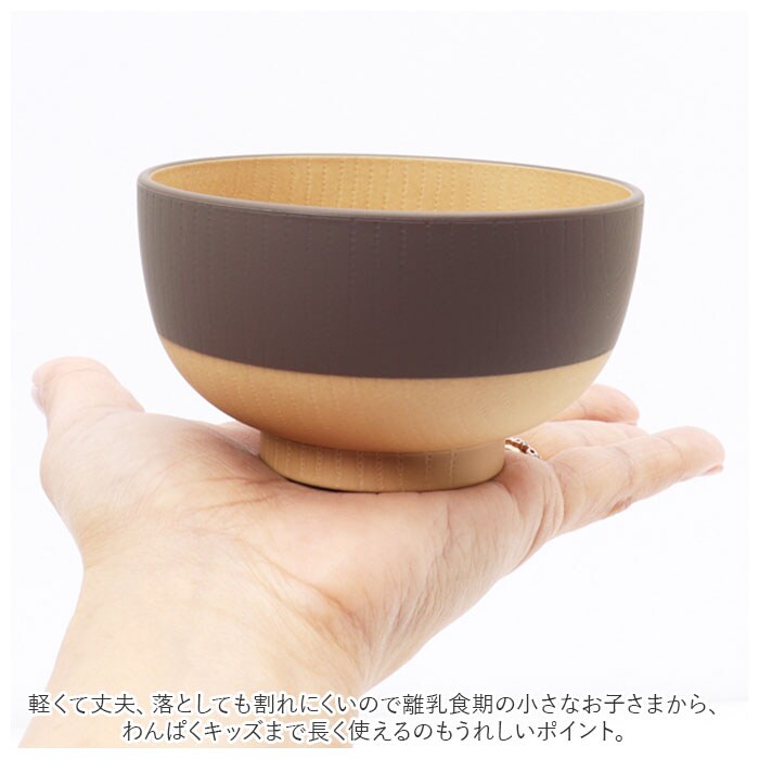 | 商品説明 | ナチュラルな木目の風合いと日本伝統の色合いが奏でるハーモニー。「やさしい彩り」シリーズに、「抗菌・キッズ飯椀」が仲間入り。「やさしい彩り」シリーズは、明るい木目調の樹脂素材を日本古来の風雅な色彩で仕上げた和食にも洋食にも映えるテーブルウェア。あたたかいお味噌汁やスープをフーフーしながら味わえる、キッズ用汁椀。お子さまの小さな手でも持ちやすい、小ぶりサイズ。PET・ABS樹脂素材表面に、まるで天然木の木肌のようなナチュラルな風合いを表現することで、温かみのある食卓をふんわりと演出。軽くて丈夫、落としても割れにくいので離乳食期の小さなお子さまから、わんぱくキッズまで長く使えるのもうれしいポイント。電子レンジでの温めや、食器洗浄機でのお手入れにもしっかり対応。さらに、いつでも清潔に使える抗菌仕様の塗装を施しているので、毎日の家事に忙しいママさんの強い味方!(※500W~600Wの電子レンジをご使用の際は、1分以上の加熱はしないでください。)表面の塗装は、樹脂製の素地に、石川県加賀市・山中温泉地区に伝わる塗装技法「山中塗り(やまなかぬり)」を施したもの。同じ「やさしい彩り」シリーズのキッズ飯椀(商品コード:kindmeshikids)と揃えて、毎日の食卓をもっと素敵にコーディネート♪瑠璃(るり)・茜(あかね)・鶯(うぐいす)など、昔ながらの日本の情緒を感じさせる優しいカラーリングも魅力のひとつ。安心の日本製品。 |