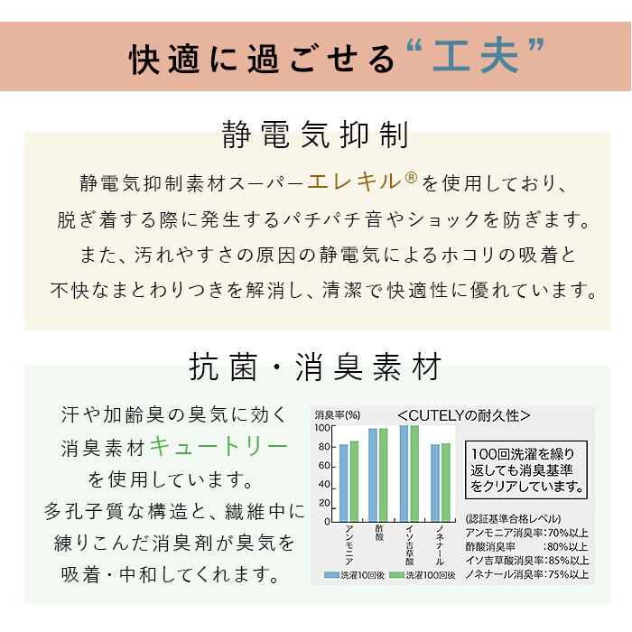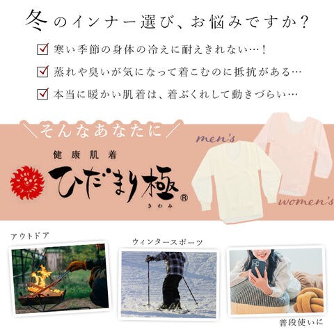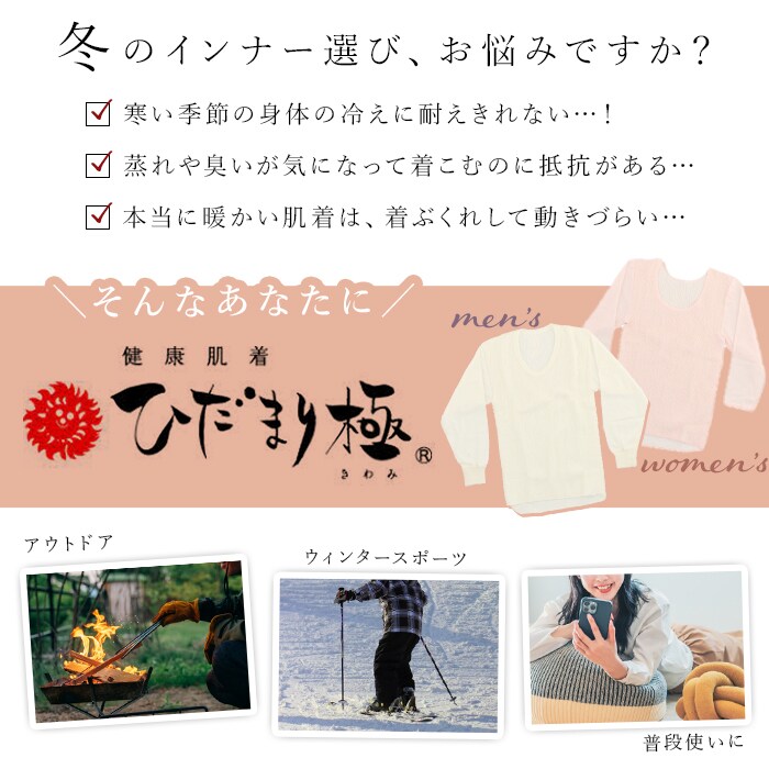 | 商品説明 | 1枚で肌着3枚分の暖かさ♪3重構造身頃で保温力バツグン!確かな機能性と驚きの保温力!速乾性、透湿性に優れたひだまりダンロン(R)を使用!身頃3重(厚手)&袖部2重(薄手)で秋冬用に最適。ひだまり極(きわみ)(婦人8分袖インナー/紳士長袖U首シャツ)体温を魔法瓶のように蓄え逃さない!空気の層で包み込む特殊加工編地。汗を外側へ放出!肌側はつねにサラサラ。肩周りゆったりで動きやすさ抜群!屈んでも背中の出ない着丈!深めの股上でお腹周りもぬくぬく。汗臭、加齢臭の原因となるアンモニアなど4つの臭気に効く消臭素材キュートリー(CUTELY)(TM)。多孔子質な構造と、繊維中に練りこんだ消臭剤が臭気を吸着中和。通常のアクリルと比較し、衣服内の湿度を適度に保ち快適な着心地を実現。静電気を防ぎ、埃の吸着、不快なまとわりつきを解消。一枚一枚化粧箱に入っているので、大切な方への贈り物にも最適。生地の製造裁断から縫製検品まで、全て日本国内で行う安心の日本製。 |