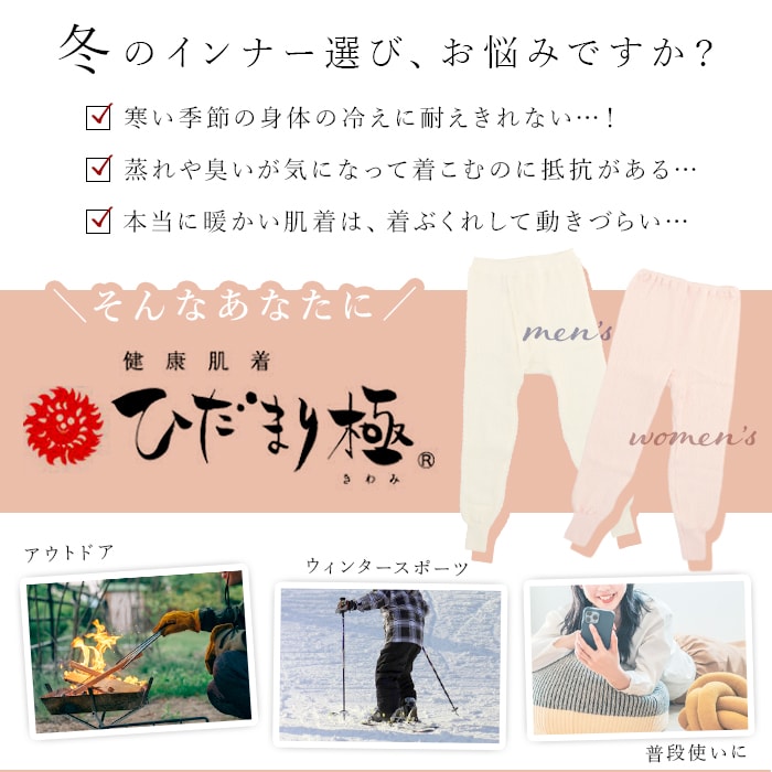 | 商品説明 | 1枚で肌着3枚分の暖かさ♪3重構造身頃で保温力バツグン!確かな機能性と驚きの保温力!速乾性、透湿性に優れたひだまりダンロン(R)を使用!身頃3重(厚手)&袖部2重(薄手)で秋冬用に最適。ひだまり極。(ズボン下/パンツ下)体温を魔法瓶のように蓄え逃さない!空気の層で包み込む特殊加工編地。汗を外側へ放出!肌側はつねにサラサラ。肩周りゆったりで動きやすさ抜群!屈んでも背中の出ない着丈!深めの股上でお腹周りもぬくぬく。汗臭、加齢臭の原因となるアンモニアなど4つの臭気に効く消臭素材キュートリー(CUTELY)(TM)。多孔子質な構造と、繊維中に練りこんだ消臭剤が臭気を吸着中和。通常のアクリルと比較し、衣服内の湿度を適度に保ち快適な着心地を実現。静電気を防ぎ、埃の吸着、不快なまとわりつきを解消。一枚一枚化粧箱に入っているので、大切な方への贈り物にも最適。生地の製造裁断から縫製検品まで、全て日本国内で行う安心の日本製。 |