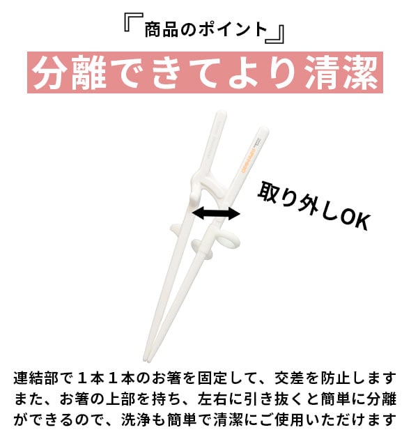 | 商品説明 | お箸のきれいな持ち方、正しい使い方を練習出来るエジソンのお箸。リングに指を入れることで正しく持てる設計になっており、リングは正しい指の角度をサポート。連結されているのでお箸が苦手な方でも練習しやすく、3つのステップで一般のお箸に移行できる仕組みになっています。 |