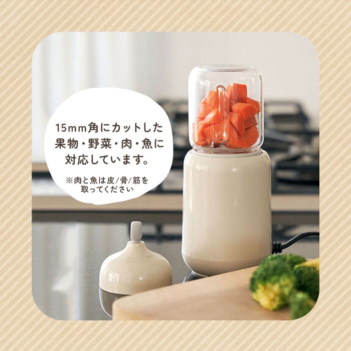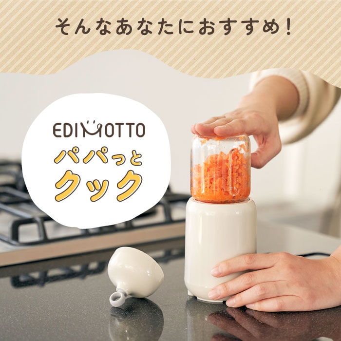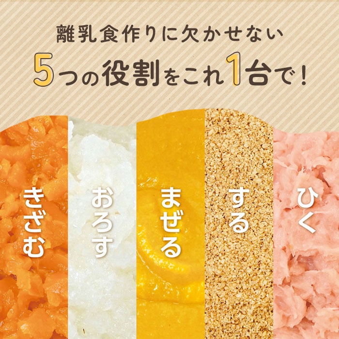 | 商品説明 | はじめての離乳食をもっと手軽に♪時短調理が叶う離乳食ブレンダー「パパっとクック」が発売。1つのアタッチメントで「きざむ・おろす・まぜる・する・ひく」が可能。1台5役の優れもの◎アタッチメントの付け替え不要、洗い物が少なくすむのが嬉しい♪少量ずつ作れるサイズだから、離乳食初期やちょっと作りたい、1品追加したい時にも便利。耐熱ガラスタイプの容器は、フタをしたまま冷蔵・冷凍保存OK!フタを外せば電子レンジも使用可能。容器、ブレードは家庭用の食洗機対応&煮沸消毒OK。容器のみ薬液消毒OK。生活に馴染みやすく、置いておくだけでおしゃれなアースカラー。コンパクトサイズで収納場所に困らない!離乳食だけでなく、料理の下ごしらえやデザート作りまで幅広く活躍!月齢別オリジナルレシピ付き。セット内容…本体・フタ・容器・ブレード使用できる食材…15mm角にカットされた果物・野菜、皮・骨・筋を取り15mm角にカットされた肉・魚使用できない食材…固い食材・乾物類・冷凍食品・粘り気の強いもの・氷 |