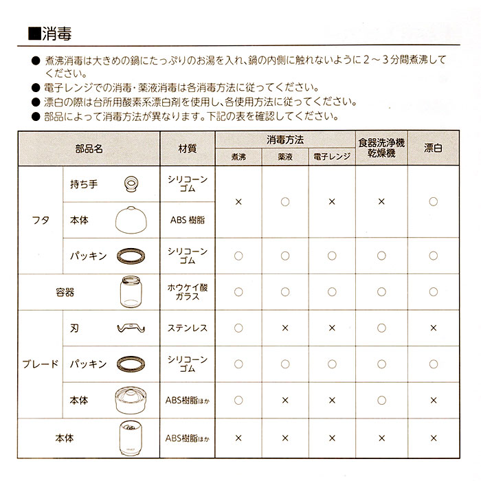 | 素材 | ・フタ [持ち手]シリコーンゴム [本体]ABS樹脂 [パッキン]シリコーンゴム ・容器:ホウケイ酸ガラス ・ブレード [刃]ステンレス [パッキン]シリコーンゴム [本体]ABS樹脂ほか ・本体:ABS樹脂ほか ・付属品:取扱説明書・レシピ |