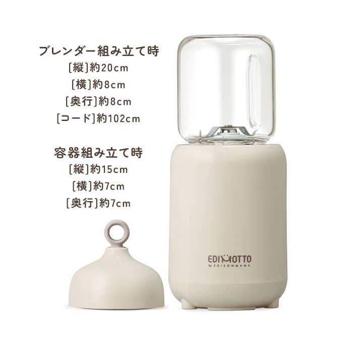 | サイズ | ・ブレンダー組み立て時 [縦]約20cm/[横]約8cm/[奥行]約8cm [コードの長さ]約102cm ・容器組み立て時 [縦]約15cm/[横]約7cm/[奥行]約7cm ※サイズは当店計測の実寸サイズです。実際の商品ならびにメーカー表記サイズとは多少の誤差が生じる場合がございます。あらかじめご了承ください。 |