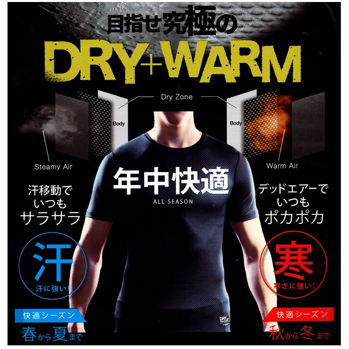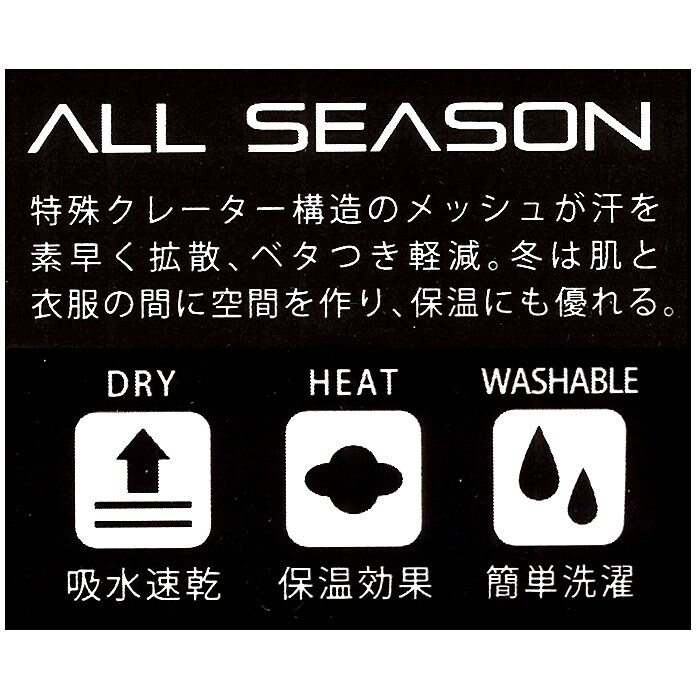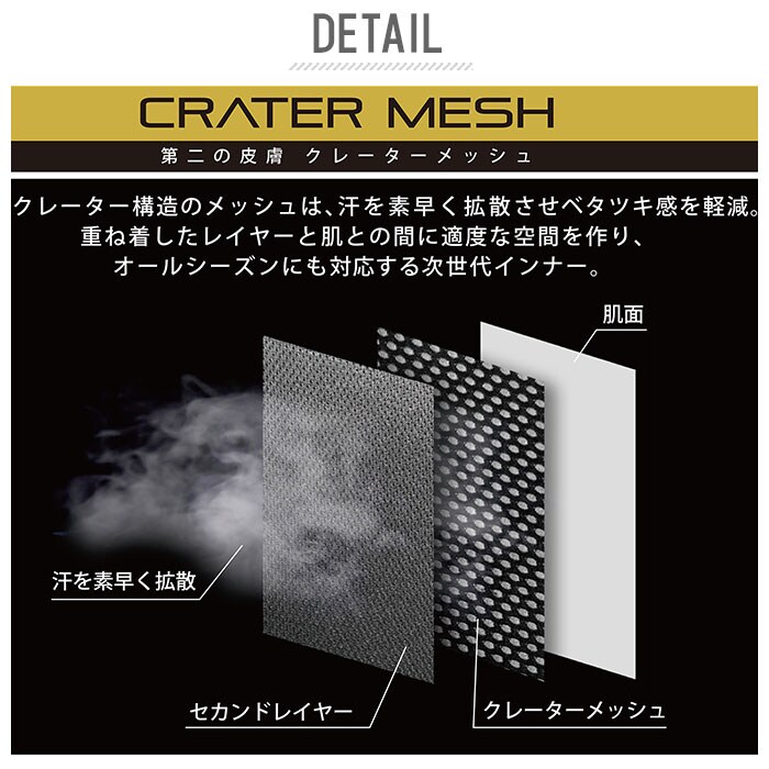 | 商品説明 | 重ね着したレイヤーと肌との間に適度な空間を作る第二の皮膚がDRY+WARMを実現。特殊クレーター構造のメッシュで汗を素早く拡散。通気性を確保しベタツキを軽減。春~夏は汗移動でいつもサラサラ。秋から冬はデッドエアーで保温し、いつもポカポカ。オールシーズン対応。ストレッチが効いて動きやすい。通勤、通学、アウトドア、スポーツ、あらゆるシーンに最適なインナー。吸水性に優れすぐ乾き、簡単洗浄。 |