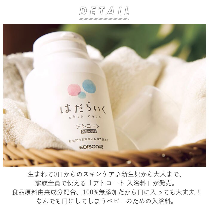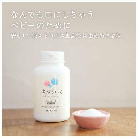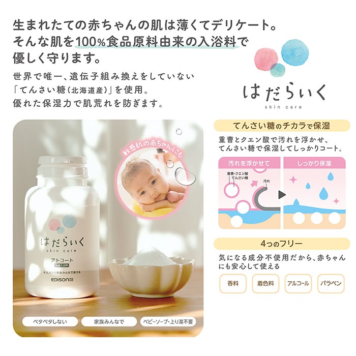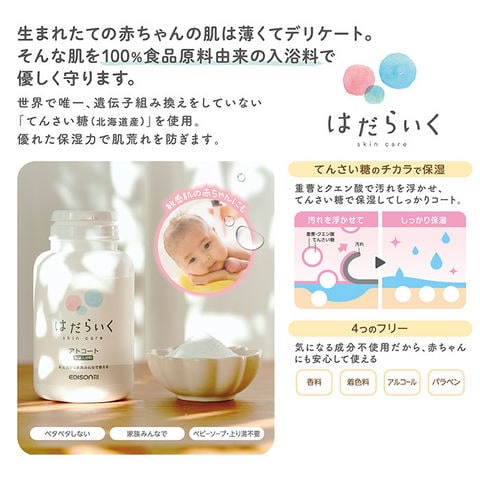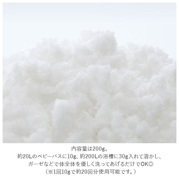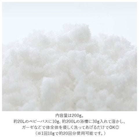 | 商品説明 | 生まれて0日からのスキンケア♪新生児から大人まで、家族全員で使える「アトコート 入浴料」が発売。食品原料由来成分配合、100%無添加だから口に入っても大丈夫!なんでも口にしてしまうベビーのための入浴料。高い保湿効果のある砂糖の中で最も優れた保湿力を持つ「てんさい糖」。世界で唯一遺伝子組み換えをしていない、北海道産のてんさい糖を使用!重曹とクエン酸のチカラで汚れを浮かし、てんさい糖の優れた保湿力でお肌をしっかりコート!肌荒れも防止。香料・着色料・アルコール・パラベンフリー!デリケートなベビーのお肌にも安心して使えるのが嬉しい♪内容量は200g。約20Lのベビーバスに10g、約200Lの浴槽に30g入れて溶かし、ガーゼなどで体全体を優しく洗ってあげるだけでOK◎(※1回10gで約20回分使用可能です。)ベビーソープや上り湯不要!お肌がベタつくことなく、しっとりとした洗い上がり。湯船の中で体が見える透明タイプ。プール遊びにも使用可能。ベビーの初めてのお風呂に最適◎ |