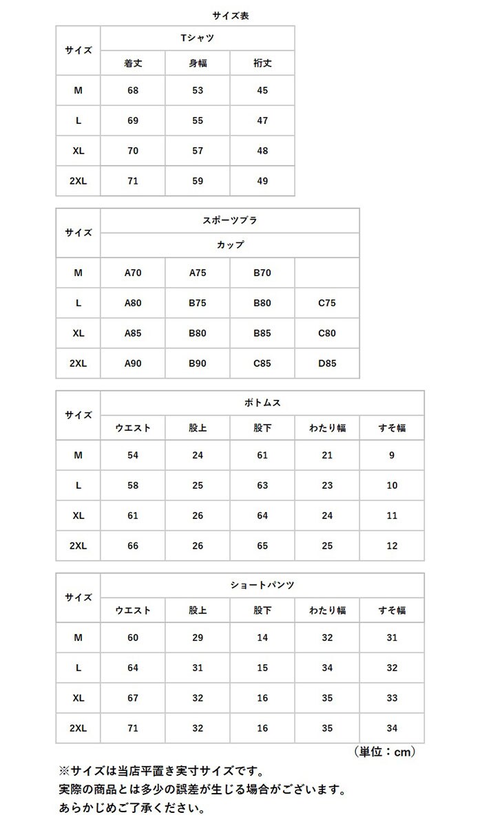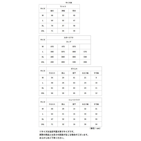 | 素材 | [Tシャツ・スポーツブラ・レギンス・ショートパンツ]ポリエステル・スパンデックス |