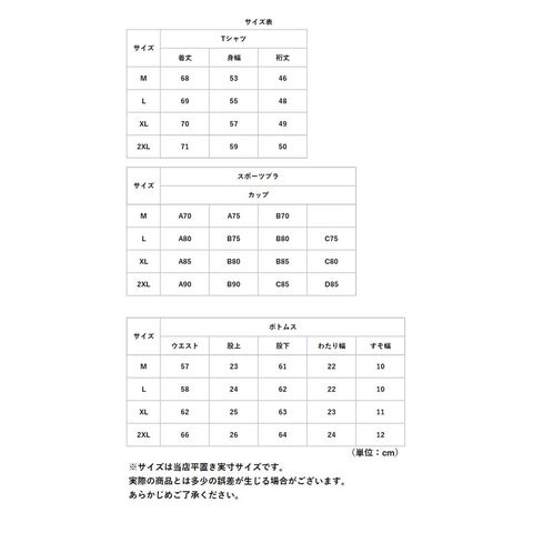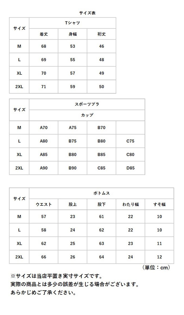 | 素材 | [Tシャツ・スポーツブラ・レギンス]ポリエステル・スパンデックス |