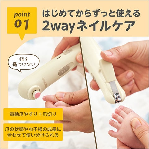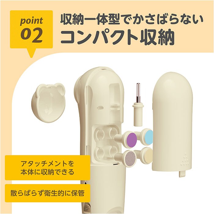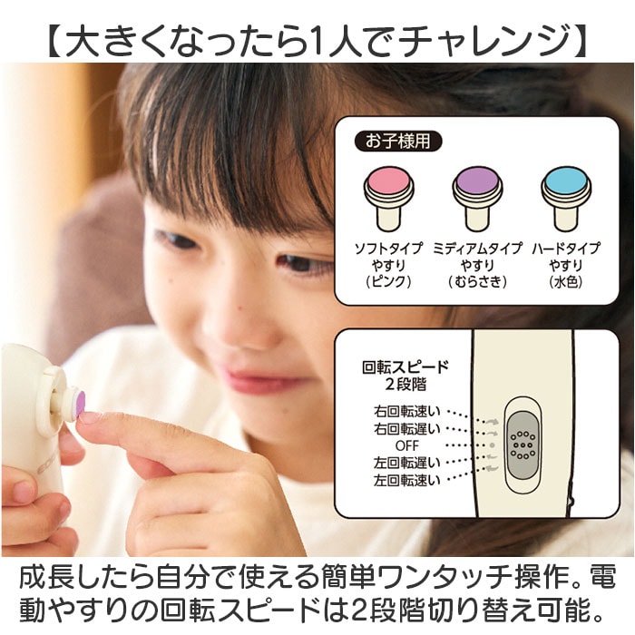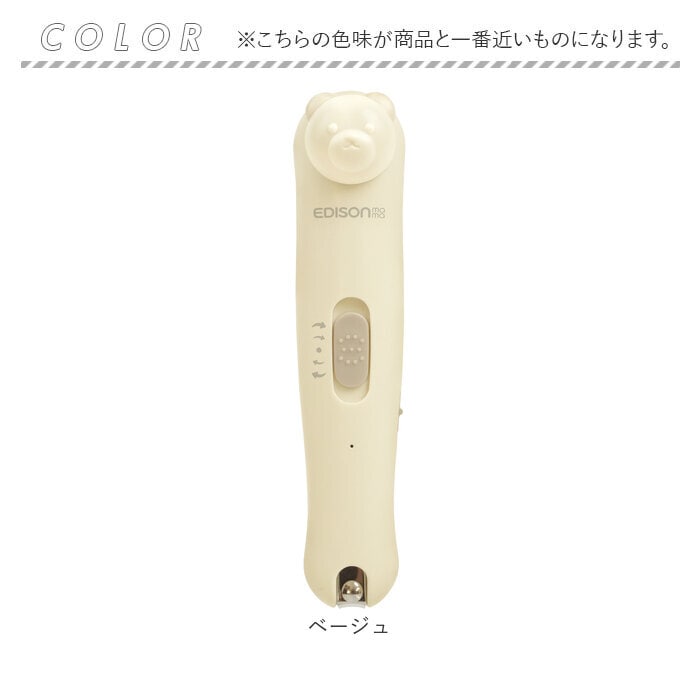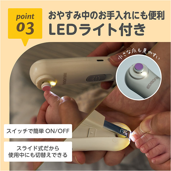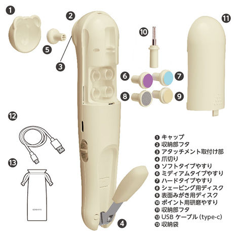 | 商品説明 | 【ベビーの爪も安心安全にお手入れ】はじめてのネイルケアに♪「EDISON mama 2WAYネイルケアセット」が新登場。【電動やすり&爪切りの2WAY仕様】電動やすりなら、指を傷つけずにケア。爪の状態や成長に合わせて、爪切りと使い分けが可能☆【0歳から大人まで長く愛用できる】子供用と大人用のアタッチメント付き。家族みんなでずっと使えるアイテム。【おやすみ中も対応!LEDライト】暗い場所でも手元が見えやすいLEDライト。スライド式スイッチで、切り替えもスムーズ。【保管しやすいコンパクト設計】電動やすりと爪切り一体型。アタッチメントも本体に収納でき、誤飲の心配もなし。【大きくなったら1人でチャレンジ】成長したら自分で使える簡単ワンタッチ操作。電動やすりの回転スピードは2段階切り替え可能。【キュートなクマさんキャップ】やすり部分にはクマさん型のキャップをON☆見た目も愛らしく、衛生的に保管。【爪切りのお手入れもラクラク】ボタン1つで取り外しできる爪切り。切った爪を捨てやすく、清潔をキープ。【どこでも使える充電式タイプ】充電式なので、サクッと使えて便利。電池交換の手間も不要。(※)type-CのUSBケーブルが付属。ACアダプターは付属しておりません。【旅行や帰省などのお供にも最適】約1.5時間の満充電で、最大3時間稼働。持ち運びしやすい収納袋付き。 |