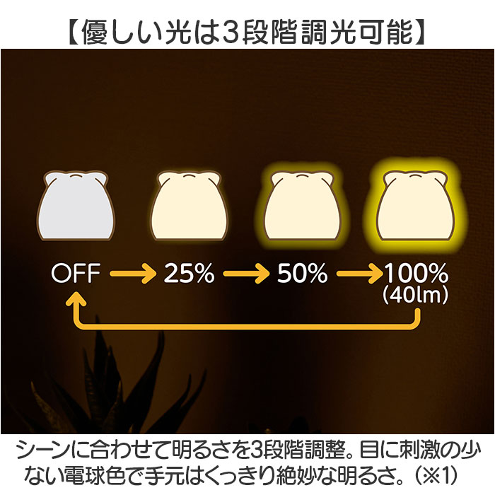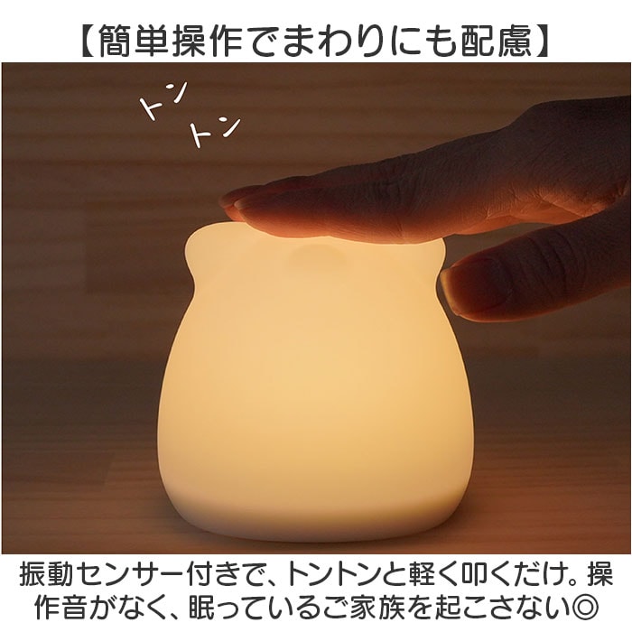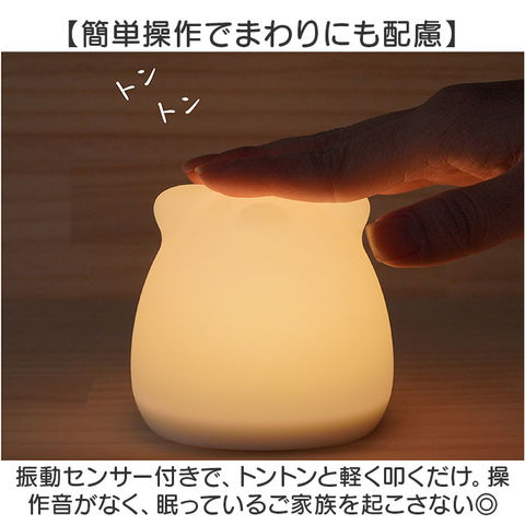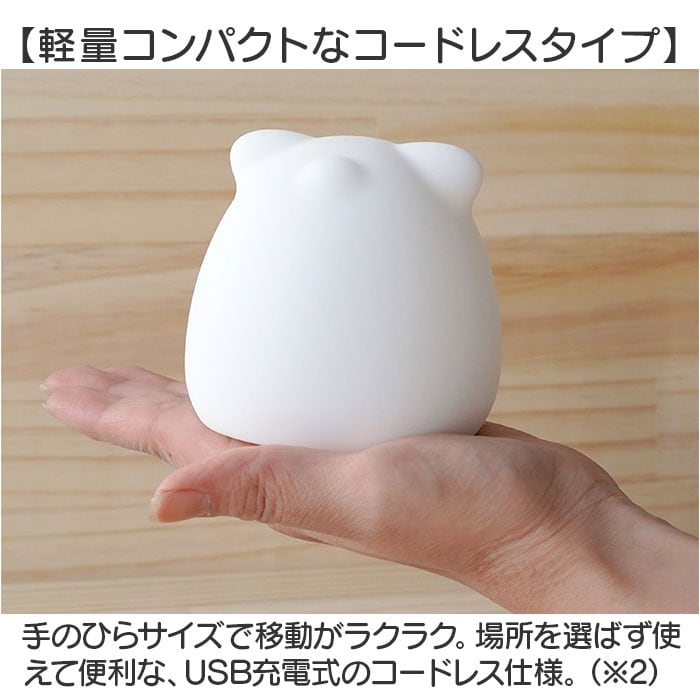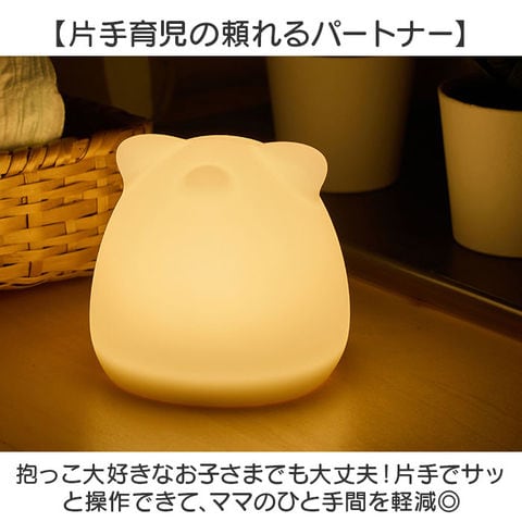 | 商品説明 | 【夜間の赤ちゃんのお世話にぴったり】優しい光と無音操作でサポート☆「EDISON mama LED授乳ランプどうぶつ」。【ころんと可愛いLED授乳ランプ】夜間のおむつ替えや調乳・授乳に重宝。心もほっこり、どうぶつフォルム♪【赤ちゃんが触れても安心の素材】柔らかなシリコーン素材を採用。赤ちゃんが触れてもケガなどの心配が不要。【簡単操作でまわりにも配慮】振動センサー付きで、トントンと軽く叩くだけ。操作音がなく、眠っているご家族を起こさない◎【優しい光は3段階調光可能】シーンに合わせて明るさを3段階調整。目に刺激の少ない電球色で手元はくっきり絶妙な明るさ。(※1)オフの状態から上面を叩くと、25%→50%→100%の3段階で切り替わります。最大点灯時の明るさは約40lm。【消し忘れを防ぐ30分タイマー】タイマースイッチを入れて点灯させると、30分後に消灯するタイマー機能付き。【軽量コンパクトなコードレスタイプ】手のひらサイズで移動がラクラク。場所を選ばず使えて便利な、USB充電式のコードレス仕様。(※2)Type-CのUSB充電式。満充電の場合、25%の明るさで最大約9時間連続点灯します。USBケーブルが付属。【片手育児の頼れるパートナー】抱っこ大好きなお子さまでも大丈夫!片手でサッと操作できて、ママのひと手間を軽減◎ |