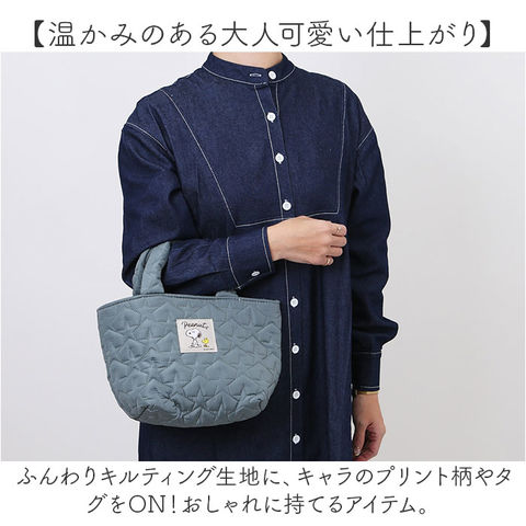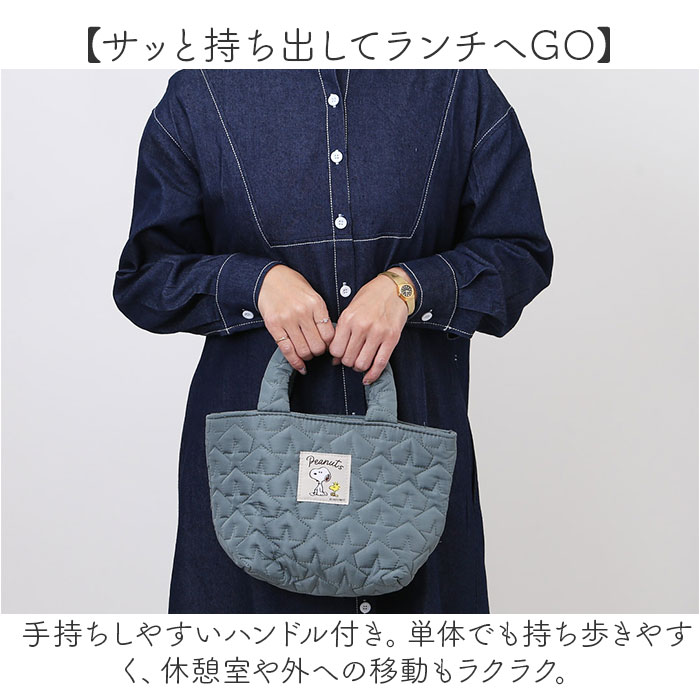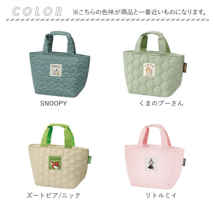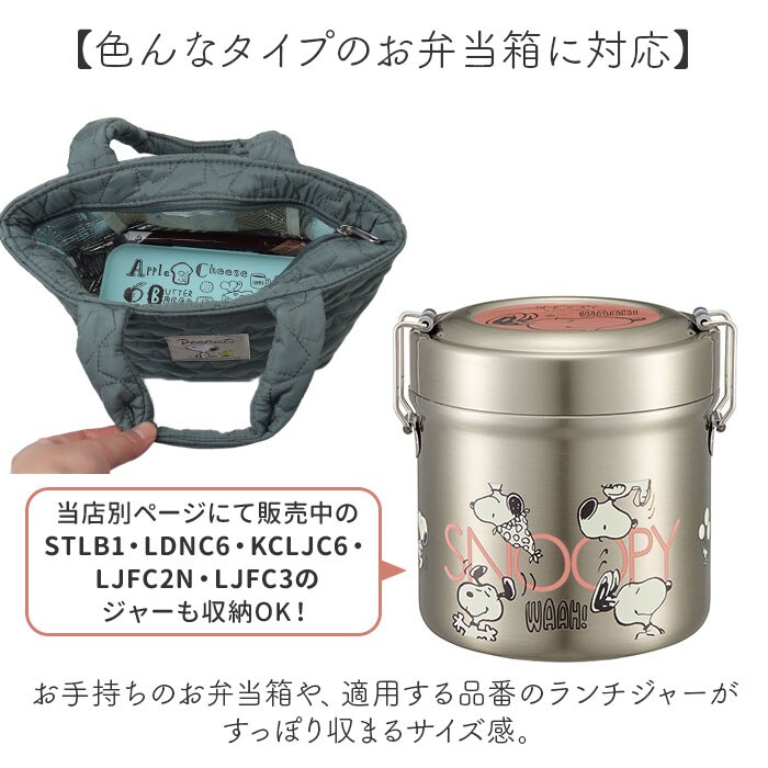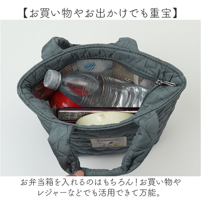 | 商品説明 | 【お弁当箱をすっきり持ち運び】ランチのお供にぴったり☆キャラクターデザインの「キルティング生地ランチバッグ」。【温かみのある大人可愛い仕上がり】ふんわりキルティング生地に、キャラのプリント柄やタグをON!おしゃれに持てるアイテム。【サッと持ち出してランチへGO】手持ちしやすいハンドル付き。単体でも持ち歩きやすく、休憩室や外への移動もラクラク。【開閉スムーズ、安心のファスナー式】ガバっと開いて取り出しやすく、ファスナーを閉じれば中身の飛び出しをガード。【保温保冷効果で持ち運びも安心】お弁当の温度変化を抑える、内側アルミ蒸着仕様。オールシーズン大活躍◎【保冷材を入れて、保冷効果アップ】メッシュポケットに、ミニサイズの保冷剤を。バッグのファスナーを閉めれば、冷気を逃さない!【色んなタイプのお弁当箱に対応】お手持ちのお弁当箱や、適用する品番のランチジャーがすっぽり収まるサイズ感。(※)当店別ページにて販売中の、STLB1・LDNC6・KCLJC6・LJFC2N・LJFC3のジャーが収納できます。【お気に入りグッズでランチを楽しく】気分を上げてくれる、人気キャラクターたち☆ランチの時間をもっと豊かに。【お買い物やお出かけでも重宝】お弁当箱を入れるのはもちろん!お買い物やレジャーなどでも活用できて万能。【ポケット仕様】内側:メッシュポケット×1 |