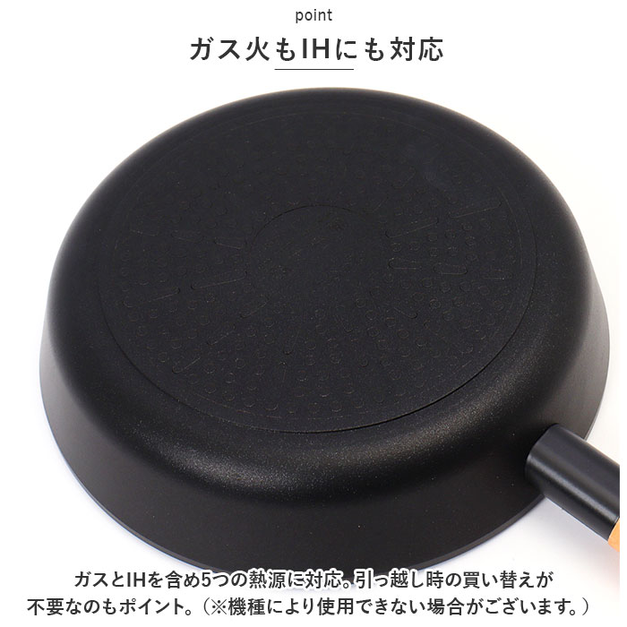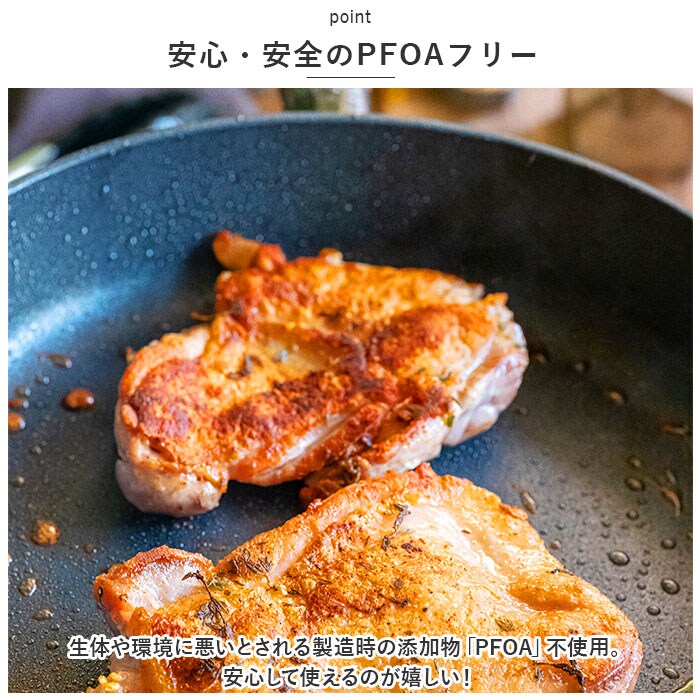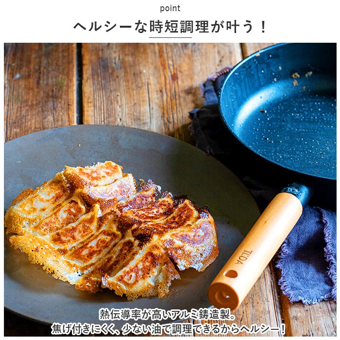 | 商品説明 | 使い勝手ばっちり。チタン&ダイヤモンドコーティングを施した、おしゃれで機能的な「TIDAフライパン」24cmサイズが新登場。【チタン&ダイヤモンドのWコーティング】フライパンの素地(アルミ)に、内面5層と外面2層のコーティングを施した合計7層構造。耐食性に優れたチタン&強度のあるダイヤモンドを配合し、汚れやキズに強いつくり。【安心・安全のPFOAフリー】生体や環境に悪いとされる製造時の添加物「PFOA」不使用。安心して使えるのが嬉しい!【ヘルシーな時短調理が叶う!】熱伝導率が高いアルミ鋳造製。焦げ付きにくく、少ない油で調理できるからヘルシー!【ガス火もIHにも対応】ガスとIHを含め5つの熱源に対応。引っ越し時の買い替えが不要なのもポイント。(※機種により使用できない場合がございます。)【使い勝手ばっちり】腕が疲れにくく、扱いやすい軽量設計。両面コーティングで汚れも落としやすく、お手入れがラクラク。【スタンダードな24cmサイズ】直径24cmのフライパンは3~4人家族におすすめ。程よい深さがあり、炒めものや汁気のあるおかずの調理にも重宝。【スタイリッシュなデザイン】内側も外側も、鉄フライパンのようなブラックカラー。ハンドルは本体を引き立たせる、天然木を使用したナチュラルなデザイン。シンプルで飽きが来ず、出しっぱなしでもサマになる♪ |