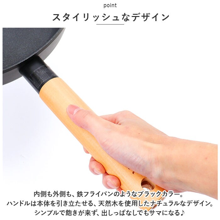 | 素材 | 【材料の種類】 [本体]アルミニウム合金 [はり底]ステンレス鋼 [取っ手]天然木 【表面加工】 [内面]フッ素樹脂塗膜加工 [外面]フッ素樹脂塗膜加工 |