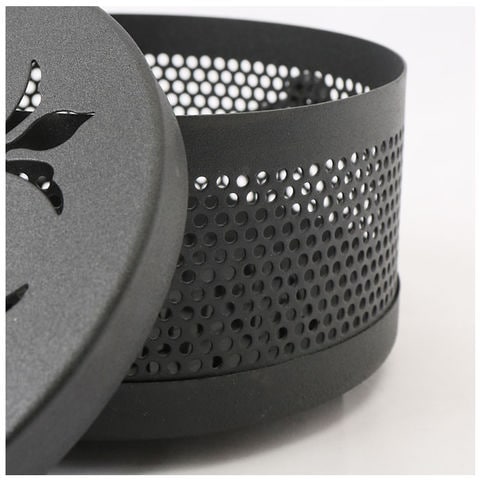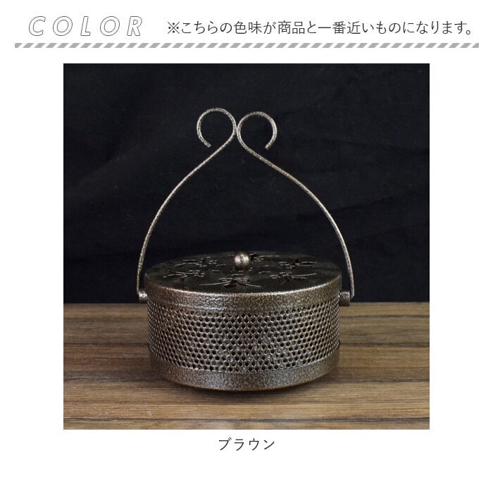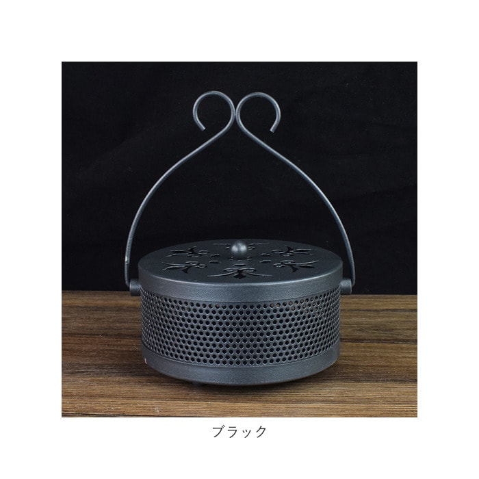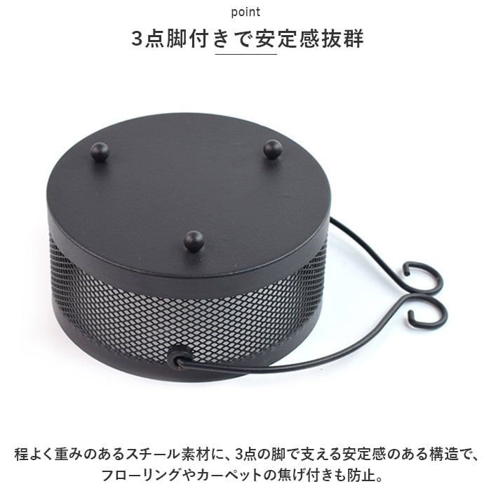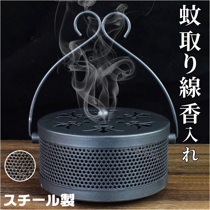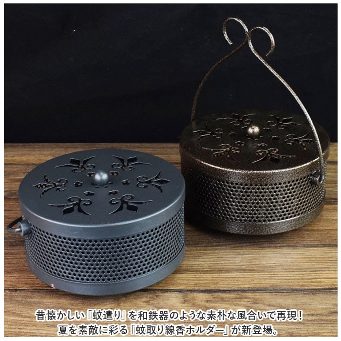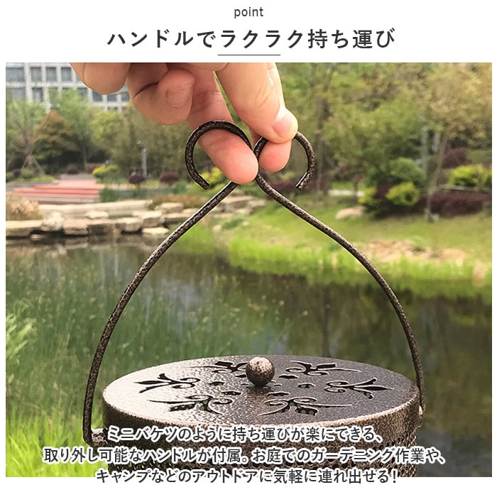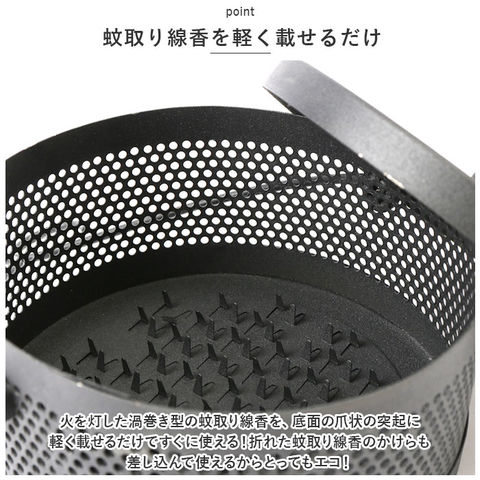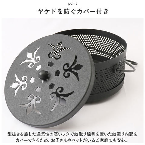 | 商品説明 | 昔懐かしい「蚊遣り」を和鉄器のような素朴な風合いで再現!夏を素敵に彩る「蚊取り線香ホルダー」が新登場。【レトロモダンなデザイン】和風鉄器のようなざらついたスチール素材表面に、優雅な草の葉紋様の型抜きを施したレトロで存在感のある蚊取り線香ホルダー。【蚊取り線香を軽く載せるだけ】火を灯した渦巻き型の蚊取り線香を、底面の爪状の突起に軽く載せるだけですぐに使える!折れた蚊取り線香のかけらも差し込んで使えるからとってもエコ!【ヤケドを防ぐカバー付き】型抜きを施した通気性の高いフタで蚊取り線香を置いた蚊遣り内部をカバーできるため、お子さまやペットがいるご家庭でも安心。【ゆっくり煙が立ち上る造り】フタの草の葉紋様に加え、側面にもドット状の穴が無数に空いているため、蚊取り線香の煙を部屋中にゆっくりと燻らせるのに最適。【3点脚付きで安定感抜群】程よく重みのあるスチール素材に、3点の脚で支える安定感のある構造で、フローリングやカーペットの焦げ付きも防止。【ハンドルでラクラク持ち運び】ミニバケツのように持ち運びが楽にできる、取り外し可能なハンドルが付属。お庭でのガーデニング作業や、キャンプなどのアウトドアに気軽に連れ出せる!【アロマ用の香炉にも】夏の風物詩、蚊取り線香をお洒落に楽しめるアンティーク感のあるデザインで、アロマ用の香炉としてもオススメ。 |
