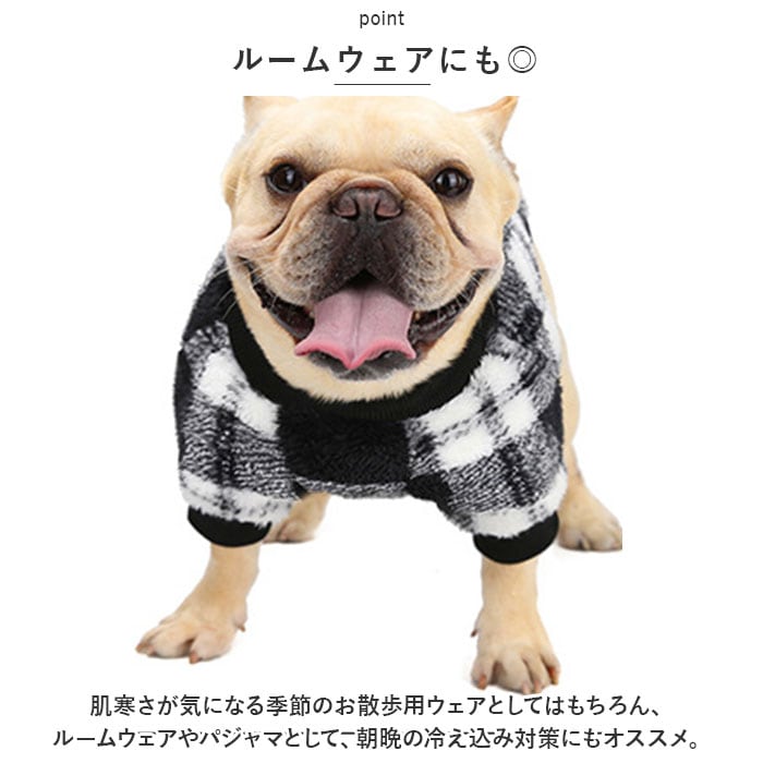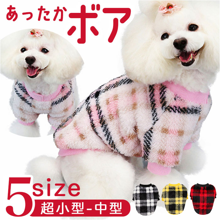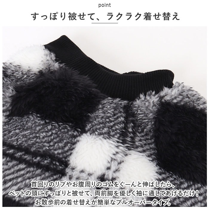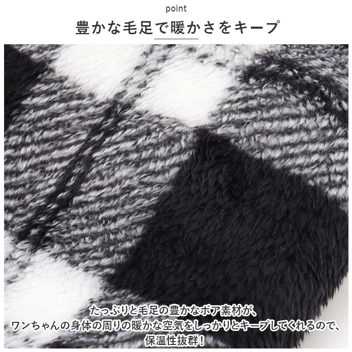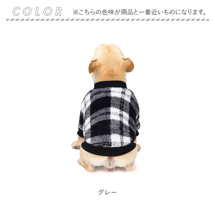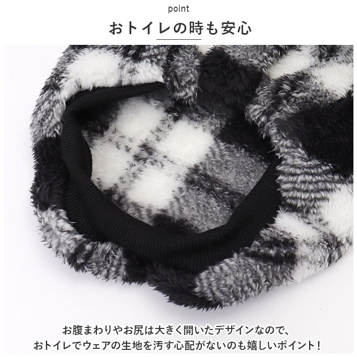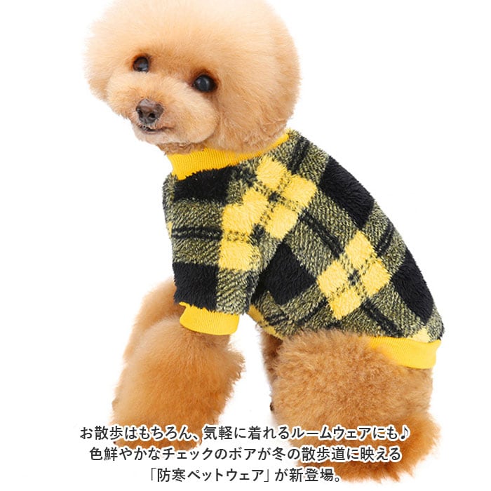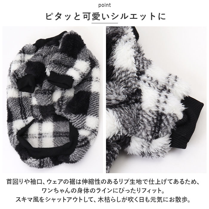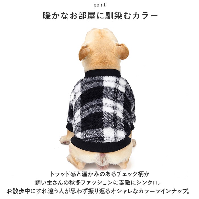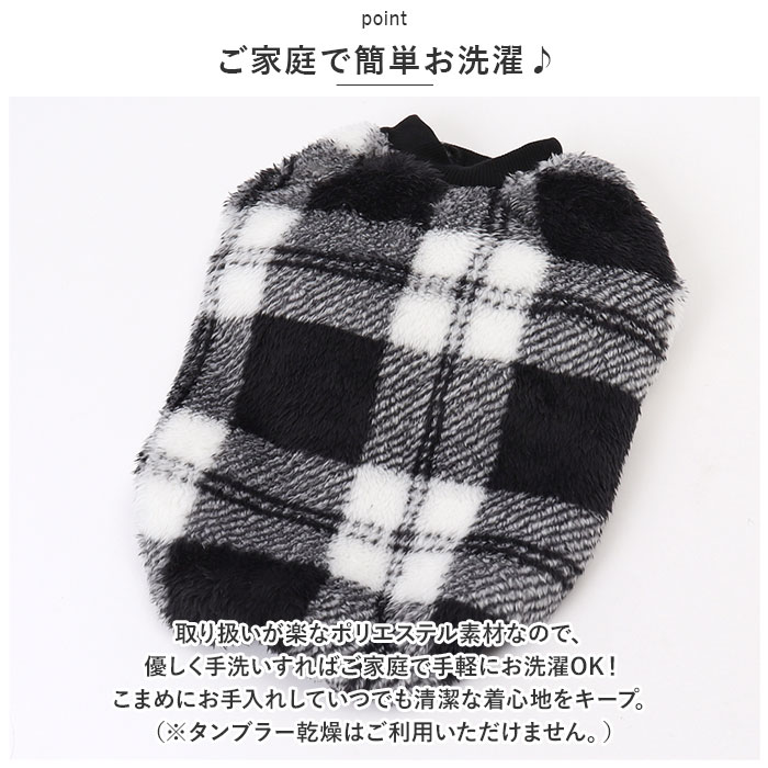 | 商品説明 | お散歩はもちろん、気軽に着れるルームウェアにも♪色鮮やかなチェックのボアが冬の散歩道に映える「防寒ペットウェア」が新登場。【ふんわり着せて、優しく防寒】ウェアの表生地と裏地、どちらも肌触りの滑らかなもこもこのボア生地仕上げ。ぽかぽかと快適な着心地で、しんしんと冷える寒い日や雪の降る日だって安心。【豊かな毛足で暖かさをキープ】たっぷりと毛足の豊かなボア素材が、ワンちゃんの身体の周りの暖かな空気をしっかりとキープしてくれるので、保温性抜群!【すっぽり被せて、ラクラク着せ替え】首回りのリブやお腹周りのゴムをぐーんと伸ばしたら、ペットの頭にすっぽりと被せて、両前脚を優しく袖に通してあげるだけ!お散歩前の着せ替えが簡単なプルオーバータイプ。【ピタッと可愛いシルエットに】首回りや袖口、ウェアの裾は伸縮性のあるリブ生地で仕上げてあるため、ワンちゃんの身体のラインにぴったりフィット。スキマ風をシャットアウトして、木枯らしが吹く日も元気にお散歩。【おトイレの時も安心】お腹まわりやお尻は大きく開いたデザインなので、おトイレでウェアの生地を汚す心配がないのも嬉しいポイント!【ご家庭で簡単お洗濯♪】取り扱いが楽なポリエステル素材なので、優しく手洗いすればご家庭で手軽にお洗濯OK!こまめにお手入れしていつでも清潔な着心地をキープ。(※タンブラー乾燥はご利用いただけません。)【ピッタリサイズをチョイス!】Sサイズから2XLサイズまでの5つのサイズから、ぴったりサイズがチョイス可能!超小型犬から、胴回り56cm程度までの中型のワンちゃんに最適なサイズ感。小さなサイズはネコちゃんにもオススメ。【暖かなお部屋に馴染むカラー】トラッド感と温かみのあるチェック柄が飼い主さんの秋冬ファッションに素敵にシンクロ。お散歩中にすれ違う人が思わず振り返るオシャレなカラーラインナップ。【ルームウェアにも◎】肌寒さが気になる季節のお散歩用ウェアとしてはもちろん、ルームウェアやパジャマとして、朝晩の冷え込み対策にもオススメ。 |