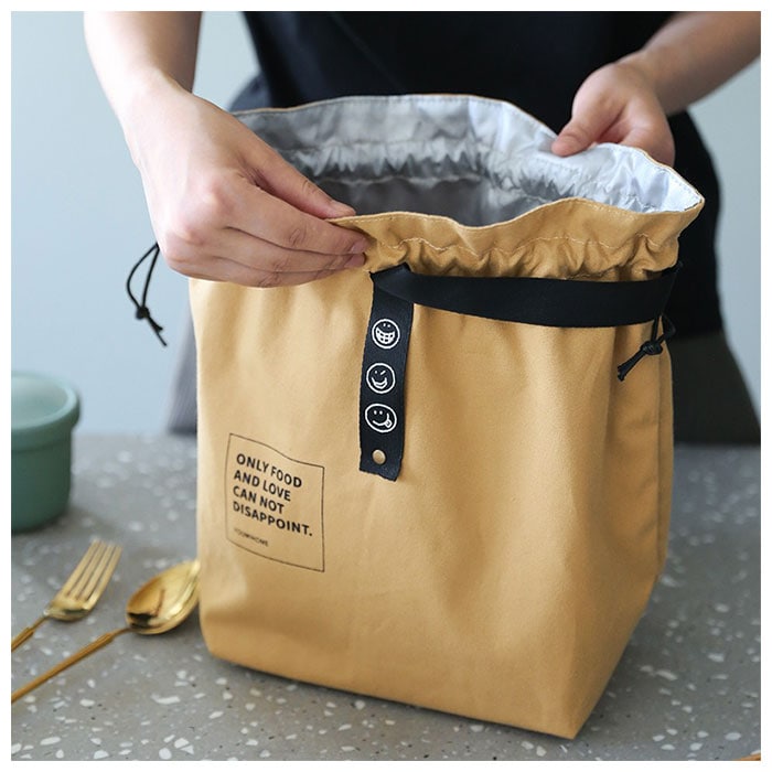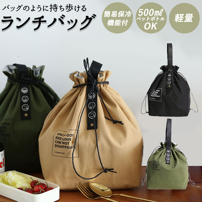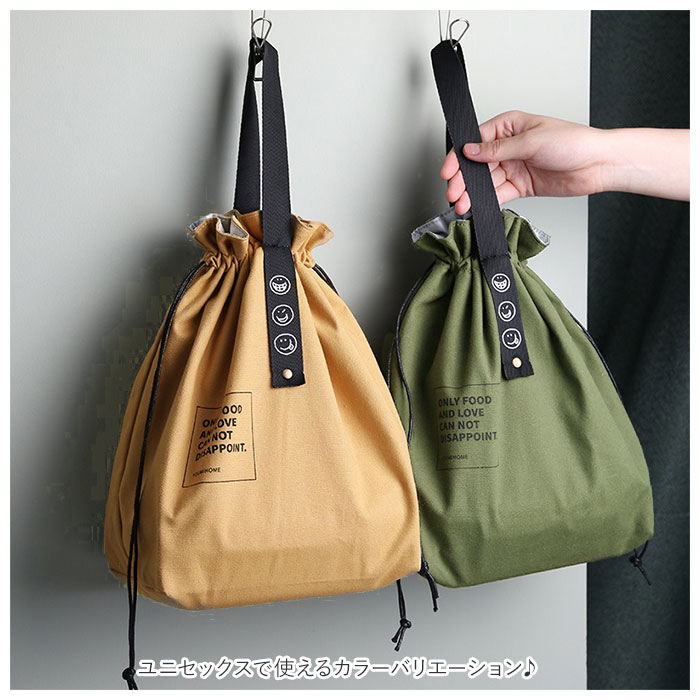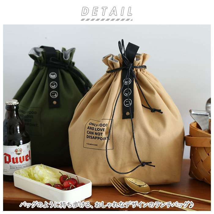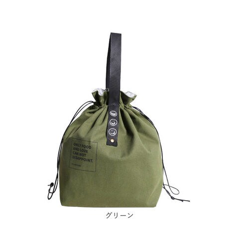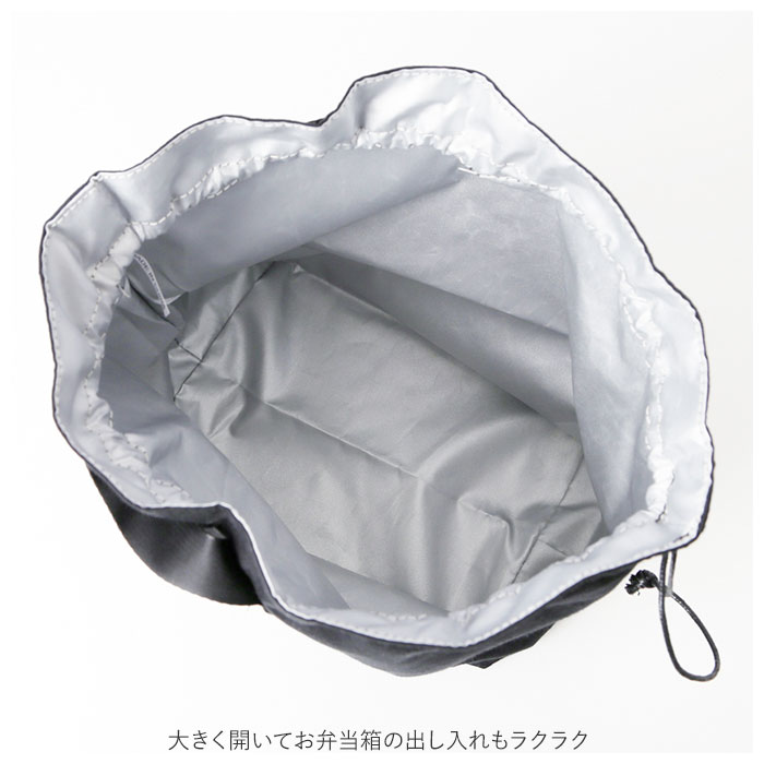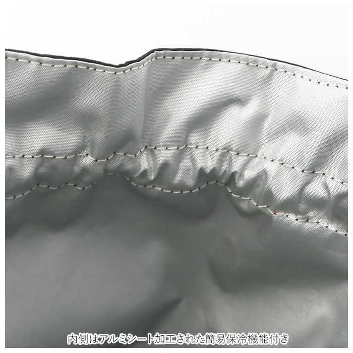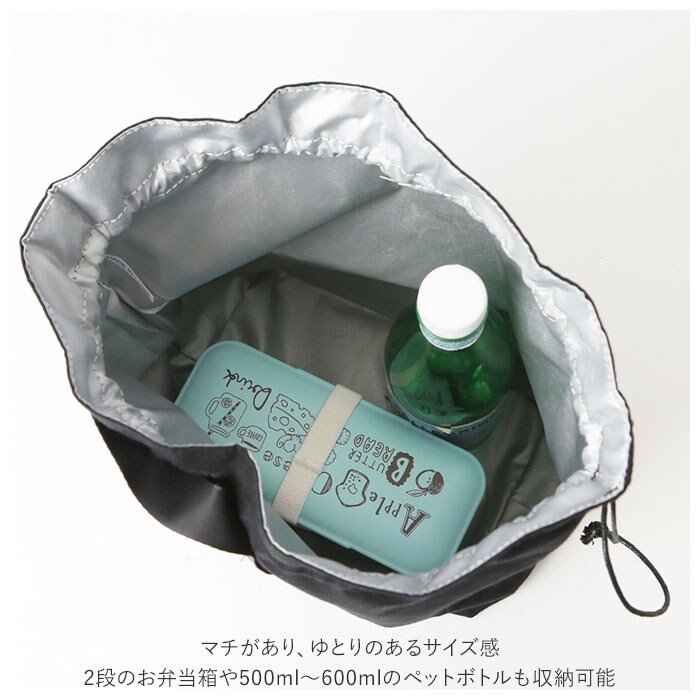 | 商品説明 | バッグのように持ち歩ける、おしゃれなデザインのランチバッグ♪中身が見えずきゅっと絞れる巾着タイプ。大きく開いてお弁当箱の出し入れもラクラク。マチがあり、ゆとりのあるサイズ感。2段のお弁当箱や500ml~600mlのペットボトルも収納可能。外側は丈夫な綿素材、内側はアルミシート加工された簡易保冷機能付き。とっても軽量で薄手の生地感だから、カバンの中でもかさばらない◎使わない時は折りたたみOK。ユニセックスで使えるカラーバリエーション♪ |