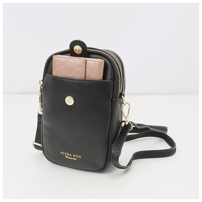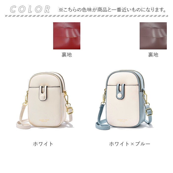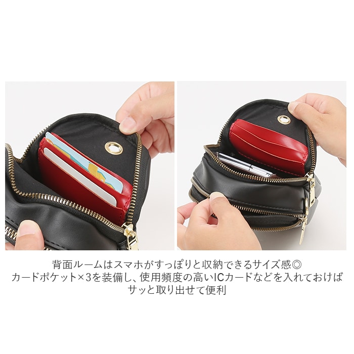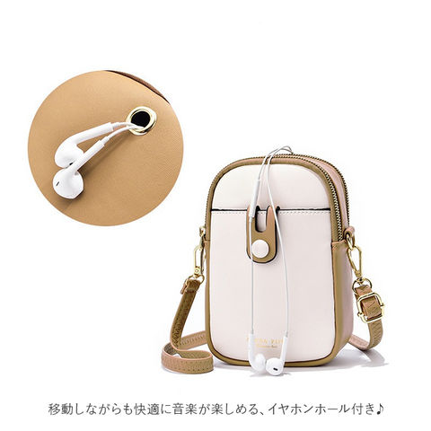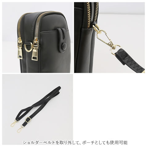 | 商品説明 | シンプルでコンパクトな、ショルダータイプのスマホポーチ。柔らかなPUレザー素材にゴールドの金具を組み合わせ、上品な印象を演出♪メインルームはミニ財布やハンカチなどが収納できて、ちょっとそこまでのお出かけにぴったり。背面ルームはスマホがすっぽりと収納できるサイズ感◎カードポケット×3を装備し、使用頻度の高いICカードなどをいてれおけばサッと取り出せて便利。さらに移動しながらも快適に音楽が楽しめる、イヤホンホール付き♪フロントポケットは、開け閉めがスムーズなマグネットボタン式。デザイン性もあり、シンプルなポーチのアクセントに!付属の長さ調節可能なショルダーベルトを取り付けて、肩掛けや斜め掛けができちゃう◎ショルダーベルトを取り外して、ポーチとしても使用可能。軽量だから、長時間肩に掛けていても負担がかかりにくいのが嬉しい。 |