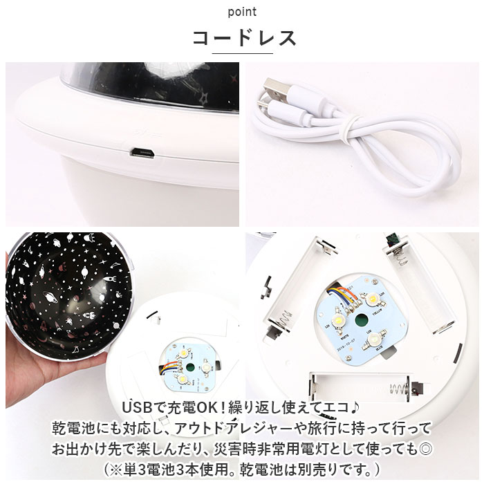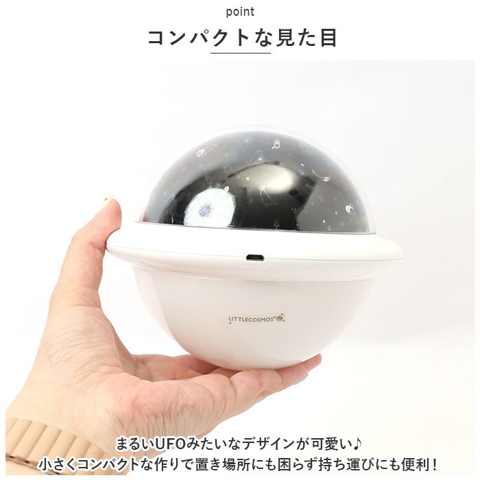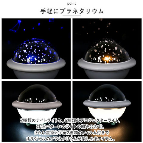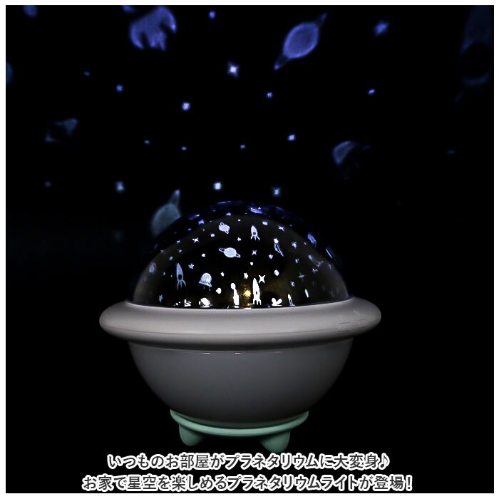 | 商品説明 | お家で星空を楽しめるプラネタリウムライトが登場!【手軽にプラネタリウム】いつものお部屋がプラネタリウムに大変身♪2種類のナイトライトと、6種類のプロジェクターライト、計12パターンのライトの組み合わせ。さらに星空と宇宙2種類のフィルム付きでオリジナルのプラネタリウムが楽しめるアイテム。【コンパクトな見た目】まるいUFOみたいなデザインが可愛い♪小さくコンパクトな作りで置き場所にも困らず持ち運びにも便利!【コードレス】USBで充電OK!繰り返し使えてエコ♪乾電池にも対応し、アウトドアレジャーや旅行に持って行ってお出かけ先で楽しんだり、災害時非常用電灯として使っても◎(※単3電池3本使用。乾電池は別売りです。)【ギフトに】お子さまやお孫さんへのギフトにもぴったり♪誕生日やクリスマス等大切な日の贈り物に喜ばれること間違いなし☆ |